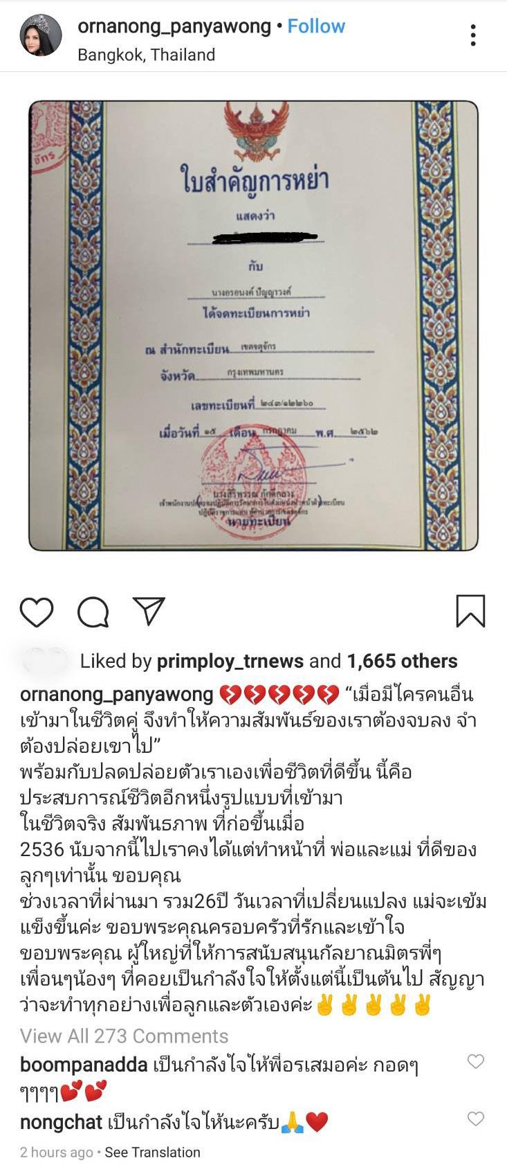 ทำเอาแฟนๆ ของนางงาม-นักแสดงสาว อรอนงค์ ปัญญาวงศ์ อดีตนางสาวไทย ปี 2535 อึ้งไปตามๆ กัน เมื่อเจ้าตัวโพสต์ภาพใบสำคัญการหย่า พร้อมทั้งเผยเหตุผลที่ตัดสินใจว่าความรักครั้งนี้ต้องจบ หลังจากครองรักกับ ชินวุธ อาวะกุล สามีหนุ่มนอกวงการที่คบหาดูใจมาตั้งแต่สมัยเรียนมหาวิทยาลัย มายาวนานถึง 26 ปี