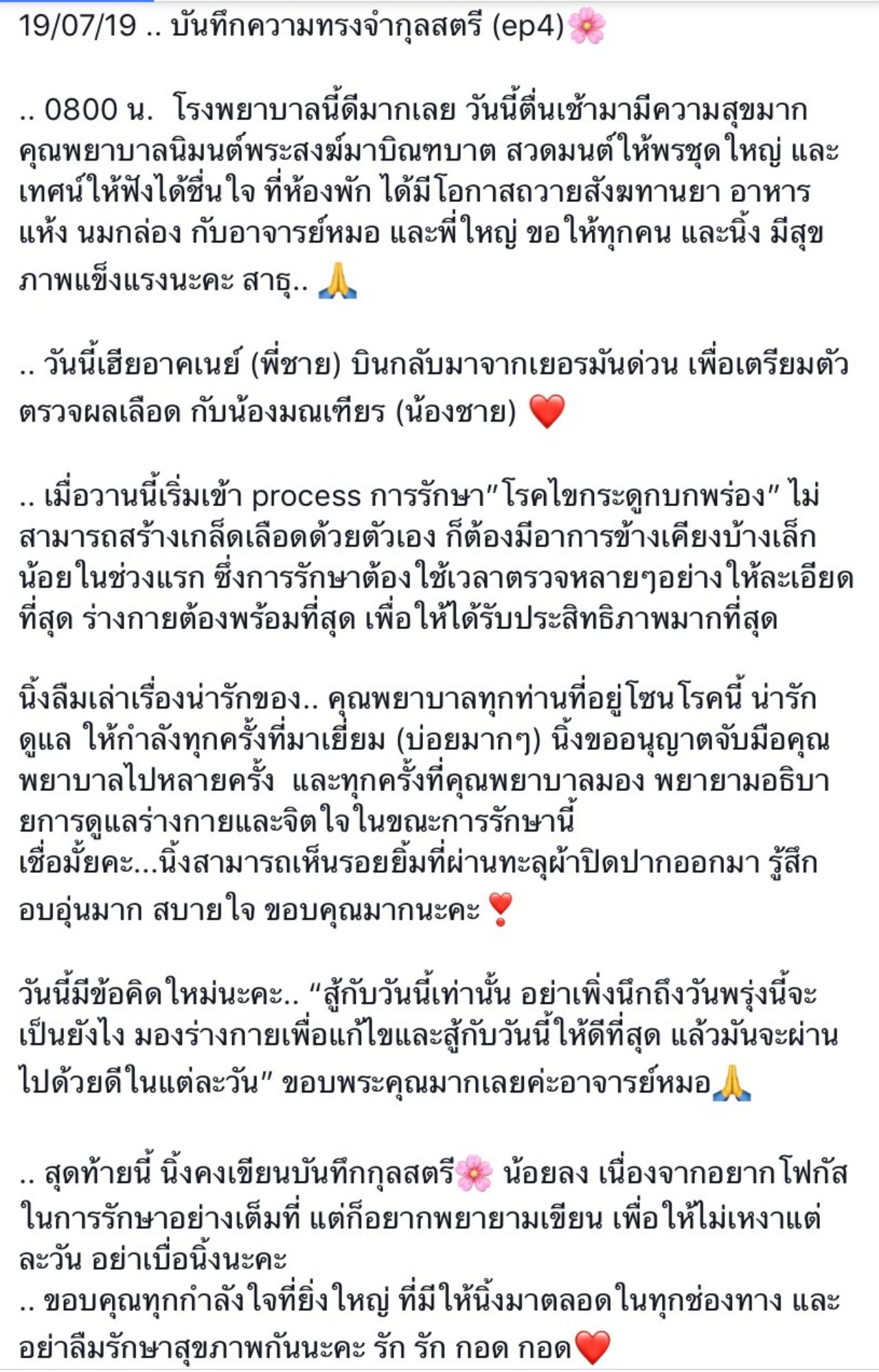 “19/07/19 .. บันทึกความทรงจำกุลสตรี (ep4) .. 08.00 น. โรงพยาบาลนี้ดีมากเลย วันนี้ตื่นเช้ามามีความสุขมาก คุณพยาบาลนิมนต์พระสงฆ์มาบิณฑบาต สวดมนต์ให้พรชุดใหญ่ และเทศน์ให้ฟังได้ชื่นใจ ที่ห้องพัก ได้มีโอกาสถวายสังฆทานยา อาหารแห้ง นมกล่อง กับอาจารย์หมอ และพี่ใหญ่ ขอให้ทุกคน และนิ้ง มีสุขภาพแข็งแรงนะคะ สาธุ..