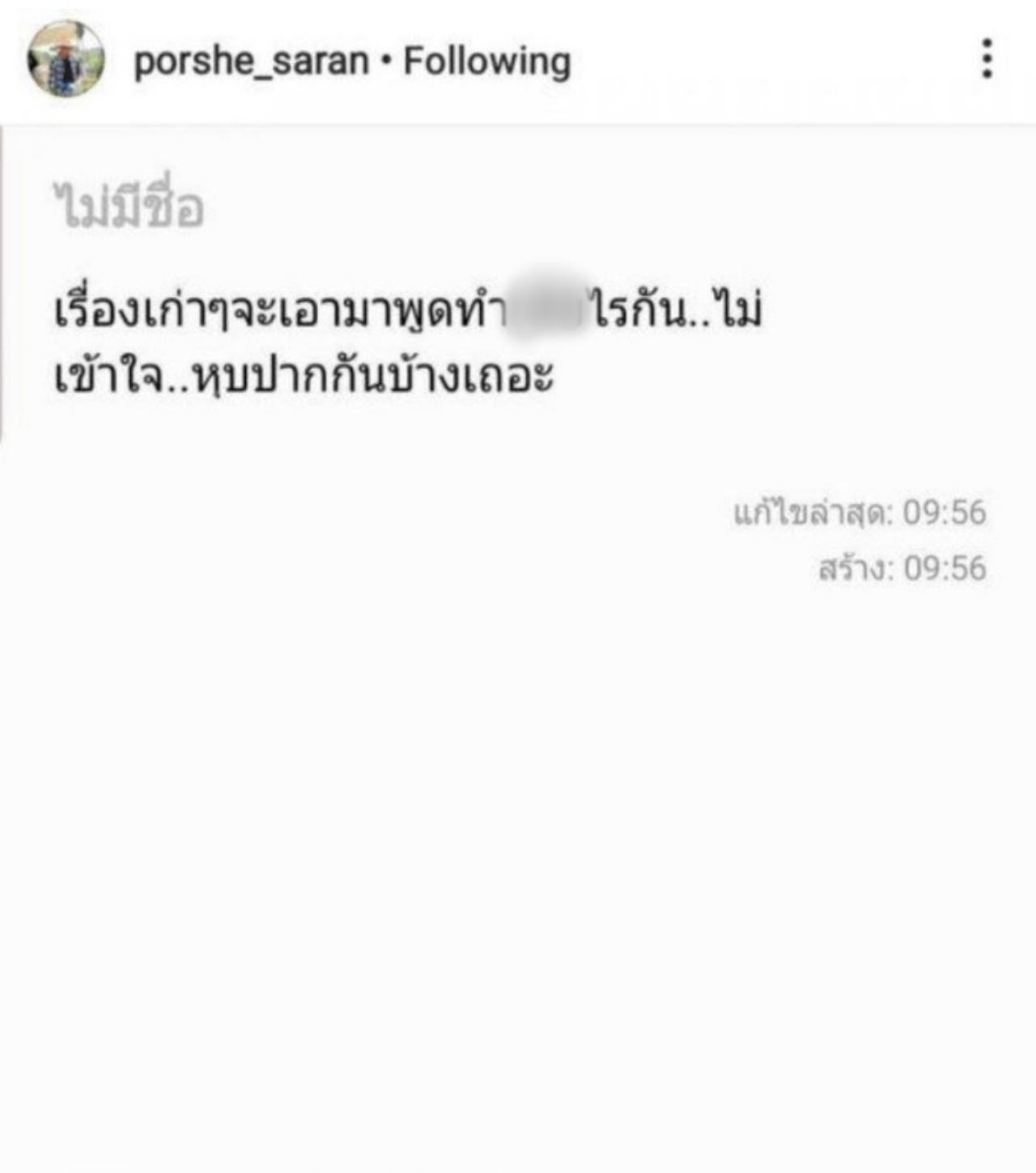 ทางด้านหวานใจหนุ่ม พอร์ช ศรัณย์ นั้นได้โพสต์ข้อความว่า “เรื่องเก่าๆ จะเอามาพูดทำ...ไรกัน .. ไม่เข้าใจ.. หุบปากกันบ้างเถอะ” ก่อนจะลบข้อความดังกล่าวทิ้ง และลงข้อความขอโทษในช่วงดึกๆ ว่า “พอร์ชต้องขอโทษทุกคนด้วยครับ กับข้อความที่โพสต์เมื่อเช้านี้ ที่พอร์ชใช้คำไม่สุภาพ ขอโทษจริงๆ ครับ และข้อความที่โพสต์ไป พอร์ชไม่ได้จะพาดพิงถึงใครเลยครับ เพราะฉะนั้นอย่าเอาไปเชื่อมโยงกันให้เกิดประเด็นต่างๆ เลยครับ ขอบคุณครับ”