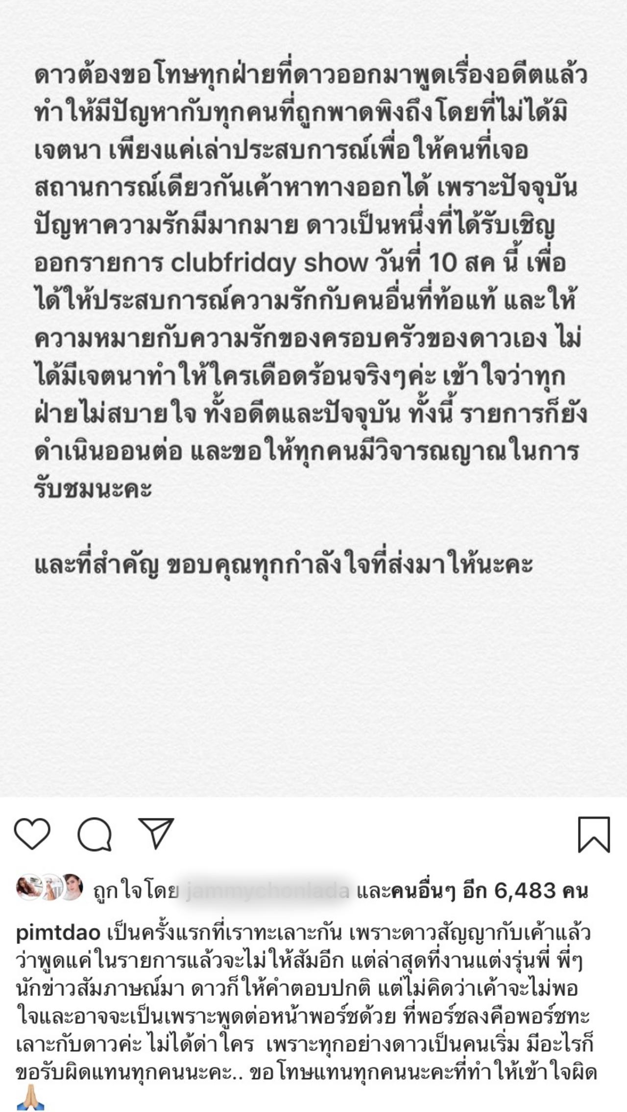 “ดาวต้องขอโทษทุกฝ่ายที่ดาวออกมาพูดเรื่องอดีต แล้วทำให้มีปัญหากับทุกคนที่ถูกพาดพิงถึงโดยที่ไม่ได้มีเจตนา เพียงแค่เล่าประสบการณ์เพื่อให้คนที่เจอสถานการณ์เดียวกันเค้าหาทางออกได้ เพราะปัจจุบันปัญหาความรักมีมากมาย ดาวเป็นหนึ่งคนที่ได้รับเชิญออกรายการ clubfriday show วันที่ 10 ส.ค. นี้