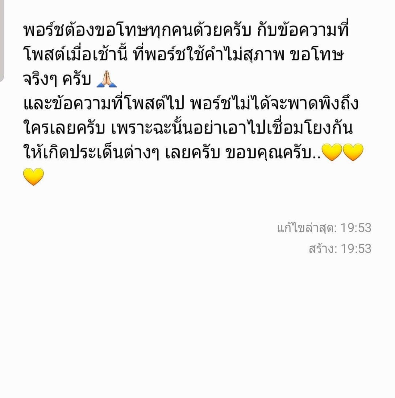 พร้อมกับแคปชั่นว่า “เป็นครั้งแรกที่เราทะเลาะกัน เพราะดาวสัญญากับเค้าแล้วว่าพูดแค่ในรายการแล้วจะไม่ให้สัมอีก แต่ล่าสุดที่งานแต่งรุ่นพี่ พี่ๆ นักข่าวสัมภาษณ์มา ดาวก็ให้คำตอบปกติ แต่ไม่คิดว่าจะไม่พอใจและอาจจะเป็นเพราะพูดต่อหน้าพอร์ชด้วย ที่พอร์ชลงคือพอร์ชทะเลาะกับดาวค่ะ ไม่ได้ด่าใคร เพราะทุกอย่างดาวเป็นคนเริ่ม มีอะไรก็ขอรับผิดแทนทุกคนนะคะ.. ขอโทษแทนทุกคนนะคะที่ทำให้เข้าใจผิด”