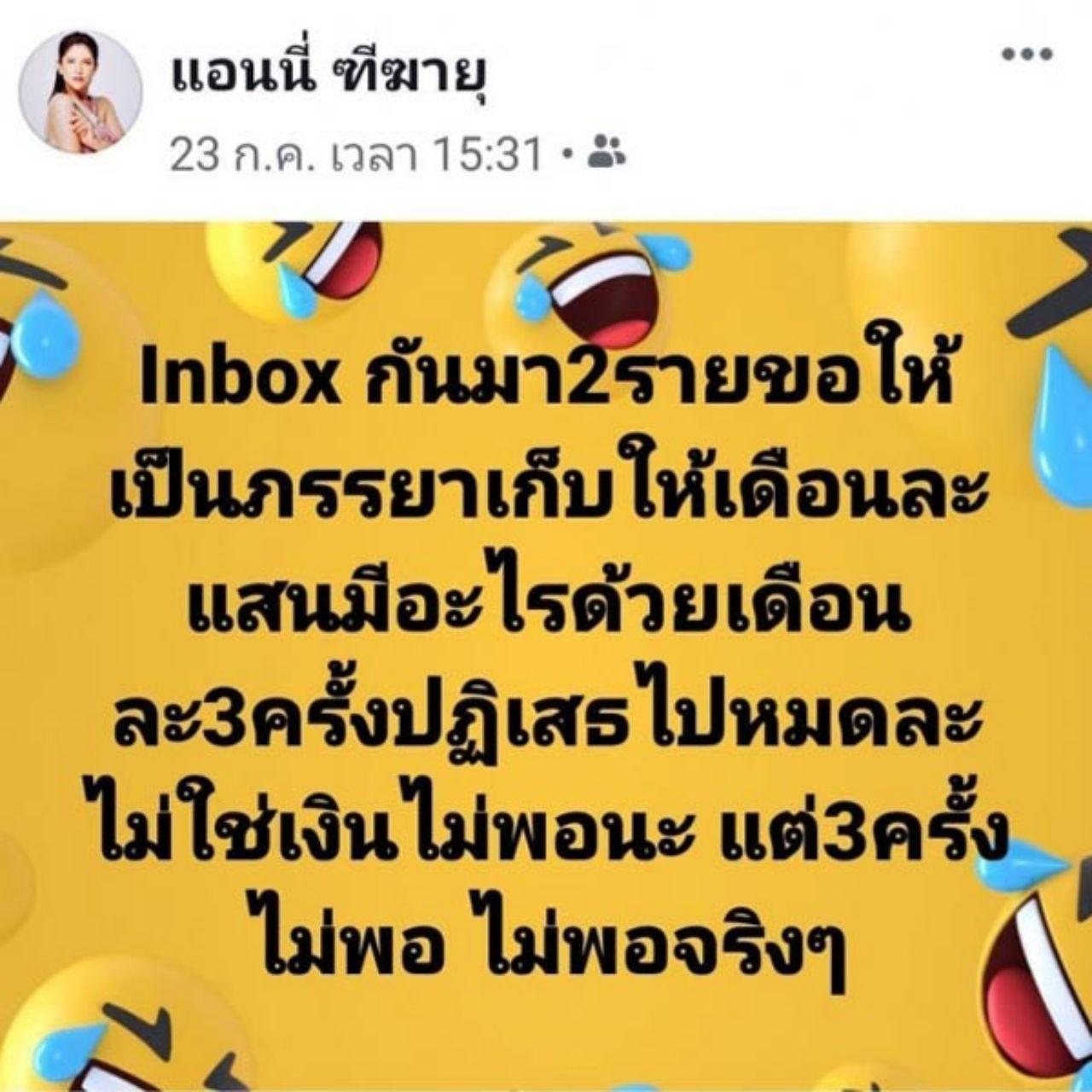 แต่ล่าสุดแอนนี่ก็เจอเรื่องกวนใจ เมื่อมีผู้ชาย 2 คน อินบ็อกซ์มาขอให้เป็นภรรยาเก็บ ให้เงินเดือนละแสน และขอมีอะไรด้วยเดือนละ 3 ครั้ง แต่เจ้าตัวก็ได้ปฏิเสธไปแล้ว พร้อมทั้งนำเรื่องดังกล่าวมาโพสต์ในเฟซบุ๊กส่วนตัวว่า “Inbox กันมา 2 ราย ขอให้เป็นภรรยาเก็บให้เดือนละแสน มีอะไรด้วยเดือนละ 3 ครั้ง ปฏิเสธไปหมดละ ไม่ใช่เงินไม่พอนะ แต่ 3 ครั้งไม่พอ ไม่พอจริงๆ”