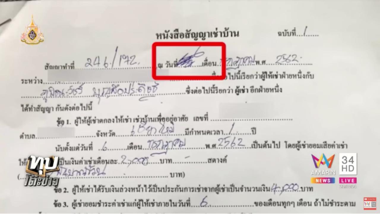 ส่วนรถที่จอดอยู่หน้าบ้านนั้น เป็นรถของคนอื่น ส่วนสัญญาเช่าบ้านนั้น เพิ่งทำเมื่อวันที่ 24 ก.ค. ที่ผ่านมา งานนี้ทางทีมข่าวเลยสงสัยว่า ไหนว่าบ้านนี้เช่ามาตั้งแต่ต้นปีแล้ว จากนั้น ธีร์ ก็รีบขีดค่าวันที่ทิ้งและเปลี่ยนเป็นวันที่ 6 ก.ค. พร้อมกับบอกว่า จำคลาดเคลื่อนไป