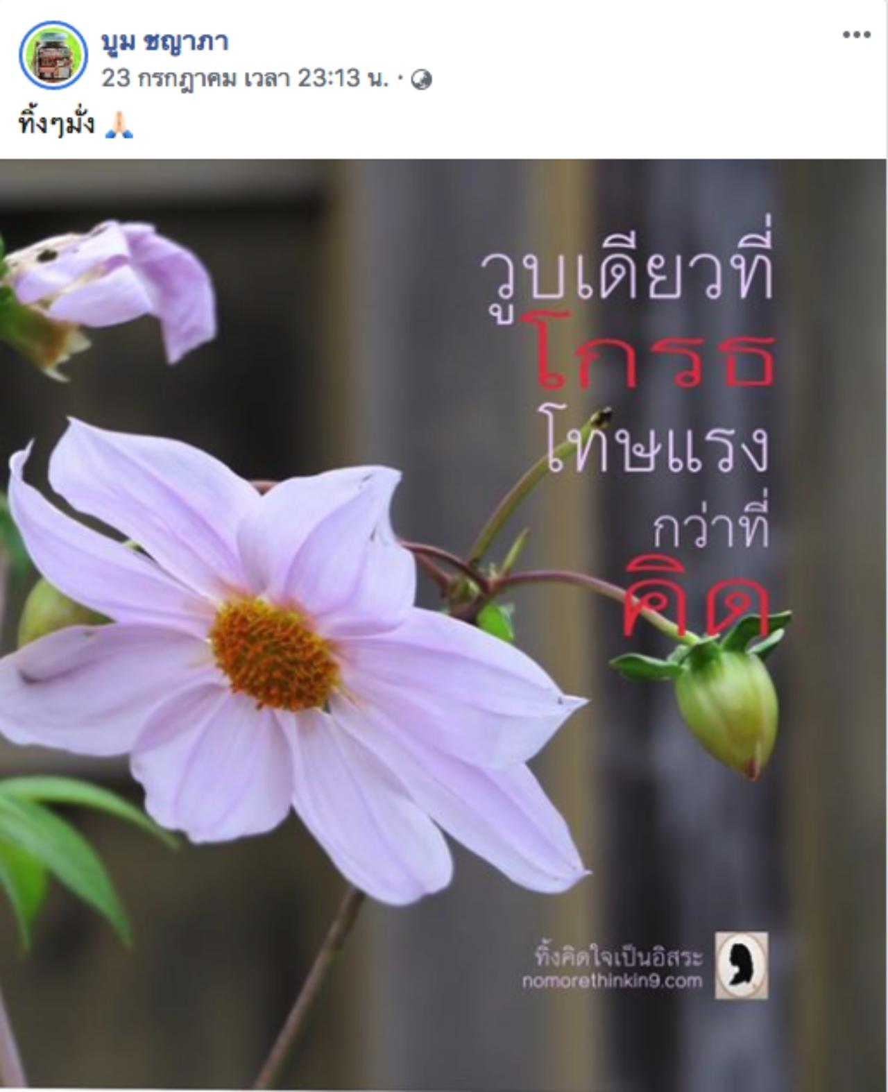 และทางด้าน บูม ชญาภา ลูกสาวของ ชูษี ก็ได้แชร์โพสต์ธรรมะสอนใจผ่านเฟซบุ๊กของตัวเองว่า "วูบเดียวที่โกรธ โทษแรงกว่าที่คิด" พร้อมเขียนแคปชั่นสั้นๆ ว่า "ทิ้งๆมั่ง" ซึ่งหลายคนที่ติดตามก็มองว่า อาจจะหมายถึงพ่อชูษีที่ประกาศไม่ให้ตนเองมาเยี่ยม