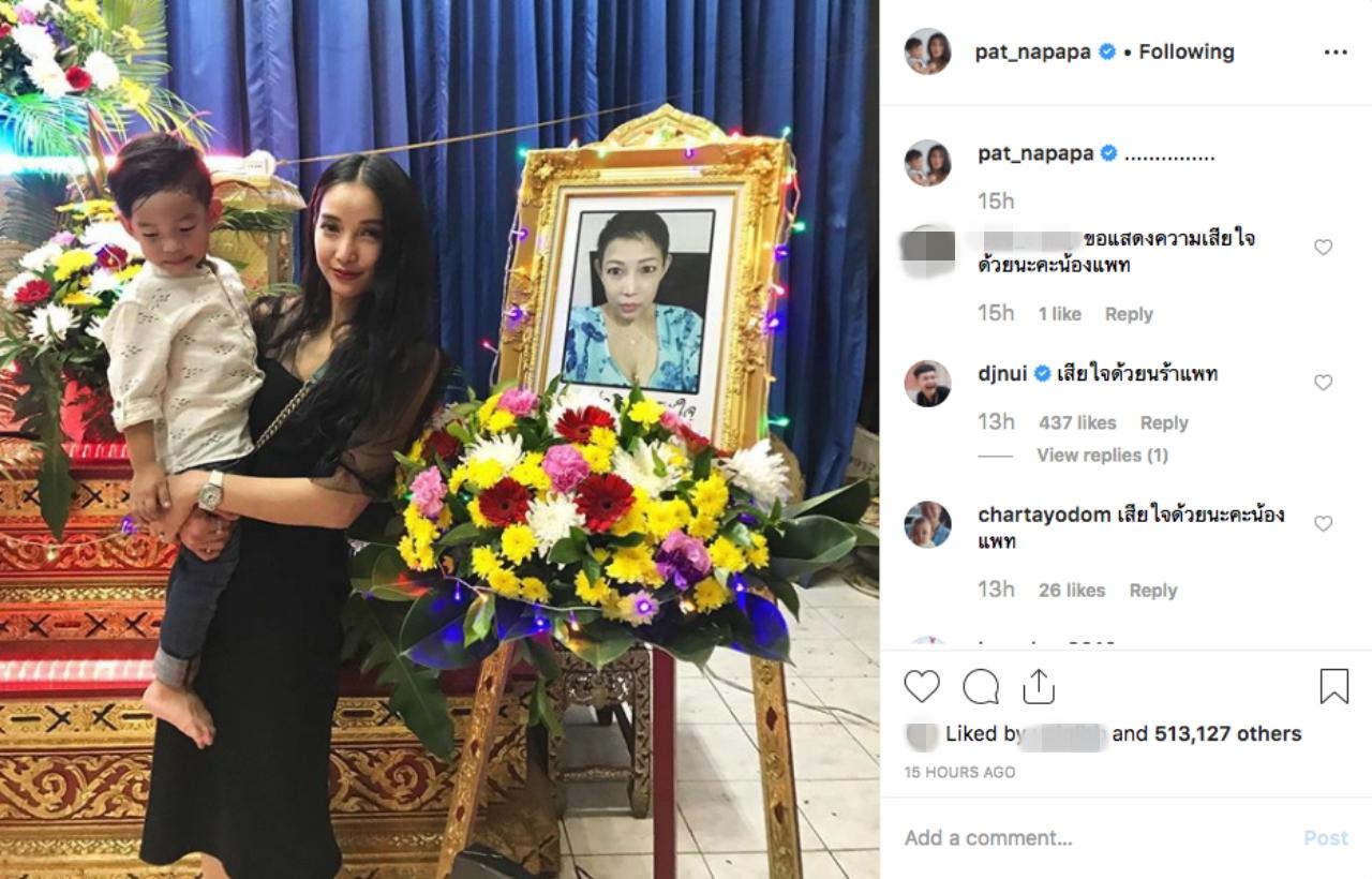 โดย แพท ได้อุ้ม น้องเรซซิ่ง ไปกราบลาคุณยายเป็นครั้งสุดท้าย ที่วัดเชียงรากน้อย จ.พระนครศรีอยุธยา เธอได้ไปพร้อมกับคุณพ่อและ นาฟ หลานสาว เพื่อไปบอกลาคุณแม่แท้ๆ เป็นครั้งสุดท้าย ซึ่งแพทได้โพสต์รูปที่ตนเองอุ้มน้องเรซซิ่งถ่ายรูปคู่กับภาพที่ตั้งหน้าศพคุณแม่ลงในอินสตาแกรม โดยไม่มีคำบรรยายภาพใดๆ แต่เชื่อว่าในใจของแพทรู้สึกเสียใจเป็นอย่างมาก เพราะยังไม่เคยได้เจอหน้าแม่แบบชัดๆ ได้มาเจอกันจริงๆ ก็ในวันที่คุณแม่จากเธอไปไกลแล้ว