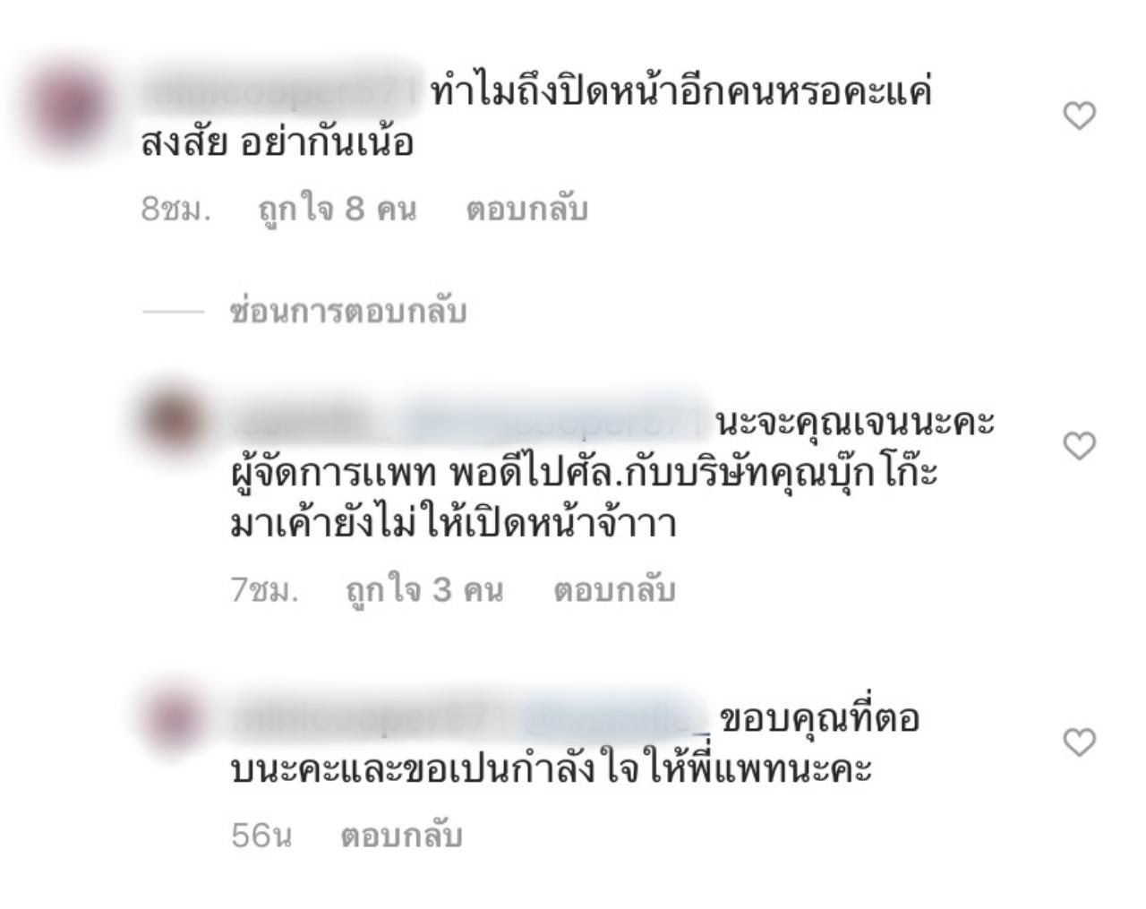 ซึ่งงานนี้สาวแพทไม่ได้เข้ามาชี้แจงคลี่คลายความสงสัยให้ชาวเน็ต แต่กลับมีชาวเน็ตด้วยกันมาชี้แจงแทนสาวแพท โดยได้บอกเอาไว้ว่า “น่าจะเป็นคุณเจนนะคะ ผู้จัดการแพท พอดีไปศัล.กับบริษัทคุณบุ๊กโกะมา เค้ายังไม่ให้เปิดหน้าจ้าาา” ซึ่งหญิงสาวที่ถูกเอาสติกเกอร์ปิดหน้าจะใช่ผู้จัดการส่วนตัวของนักแสดงสาวหรือไม่ คงต้องรอฟังคำตอบจากปากสาวแพทเองน่าจะชัวร์กว่า