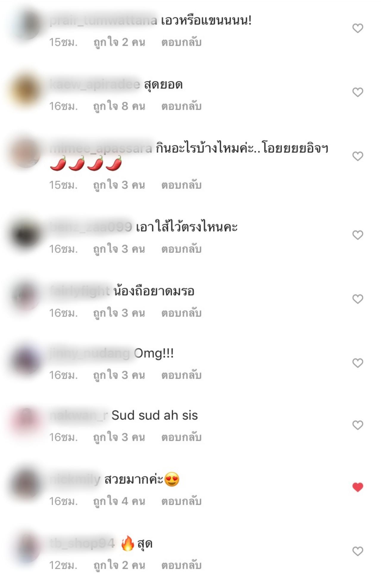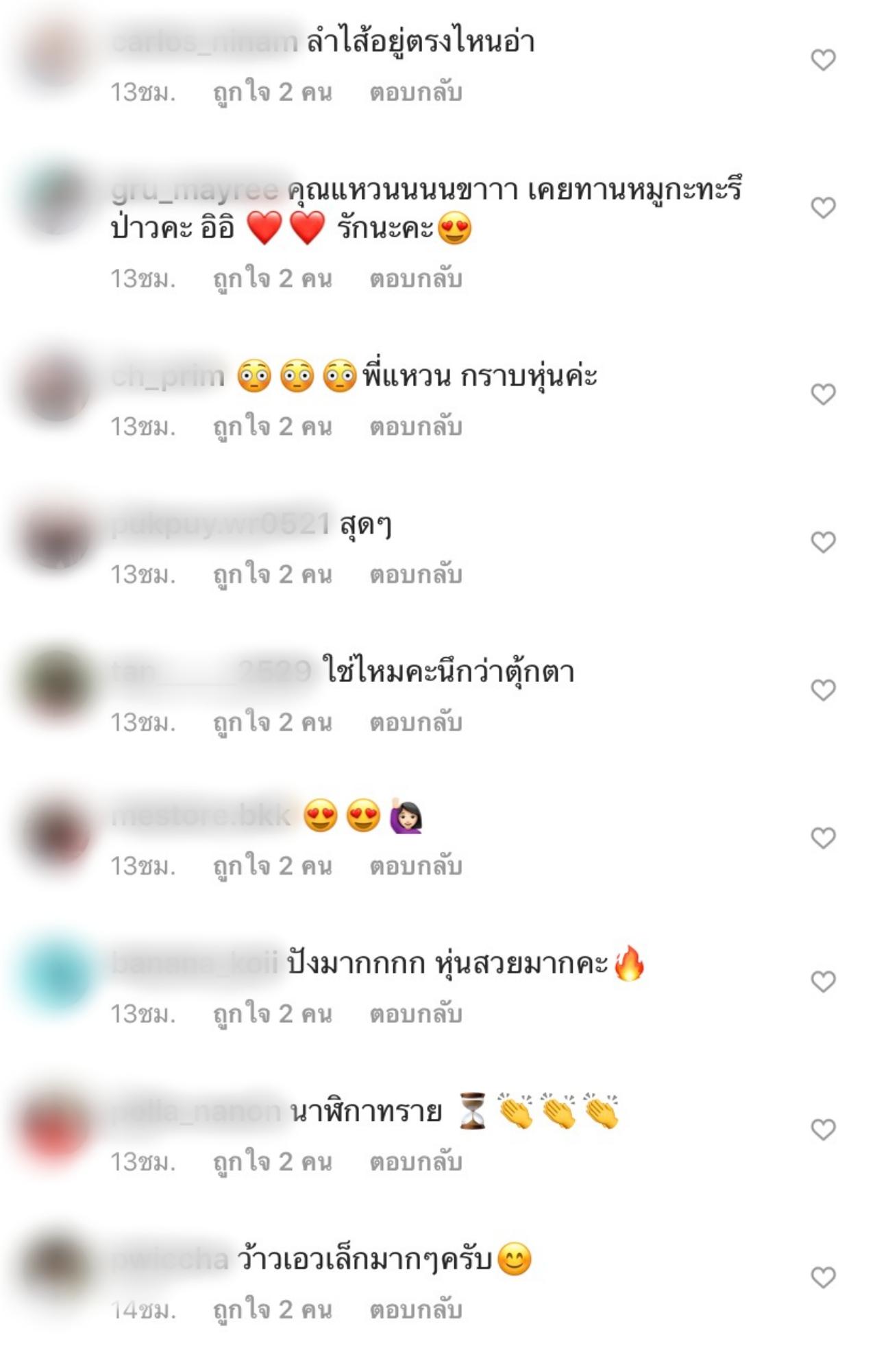 หลังจากที่สาวแหวนแหวนอวดเอวกิ่วลงในอินสตาแกรมไป ก็มีชาวน็ตเข้าไปคอมเมนต์ชื่นชม ขอเคล็ดลับเอวเล็ก และแอบแซวไฮโซสาวมากมาย ไม่ว่าจะเป็น เอวเล็กเท่ากับแขน, เคยกินหมูกระทะบ้างหรือเปล่า และเอาไส้ไว้ตรงไหน แต่ที่แน่ๆ เชื่อว่าหลายคนยอมแพ้กับความเอวบางของไฮโซสาวกันเป็นแถว