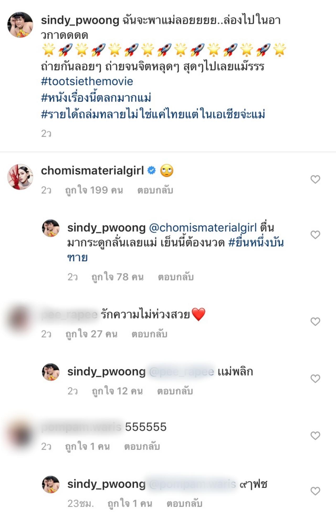 โดยล่าสุด สาวชมพู่ได้หวนกลับมารับเล่นหนังอีกครั้งเรื่อง ตุ๊ดซี่ส์ เดอะมูฟวี่ ซึ่งทำเอา ปิงปอง ธงชัย ทองกันธม หรือ ปิงปอง ไดอารี่ตุ๊ดซี่ส์ ที่ได้ร่วมงานกับสาวชมพู่เป็นครั้งแรก ถึงกับดีใจไม่น้อย และงานนี้ปิงปองก็ไม่พลาดที่จะขอแชะภาพถ่ายรูปกับสาวชม แต่งานนี้ไม่ใช่การถ่ายรูปแบบสวยๆ แต่เป็นการถ่ายภาพแบบไม่ห่วงสวย ด้วยการเหลือกตามองขึ้นบน พร้อมแคปชั่นว่า “ฉันจะพาแม่ลอยยยย..ล่องไปในอาวกาดดดด ถ่ายกันลอยๆ ถ่ายจนจิตหลุดๆ สุดๆ ไปเลยแม๊รรร #tootsiethemovie #หนังเรื่องนี้ตลกมากแม่ #รายได้ถล่มทลายไม่ใช่แค่ไทยแต่ในเอเชียจ่ะแม่”