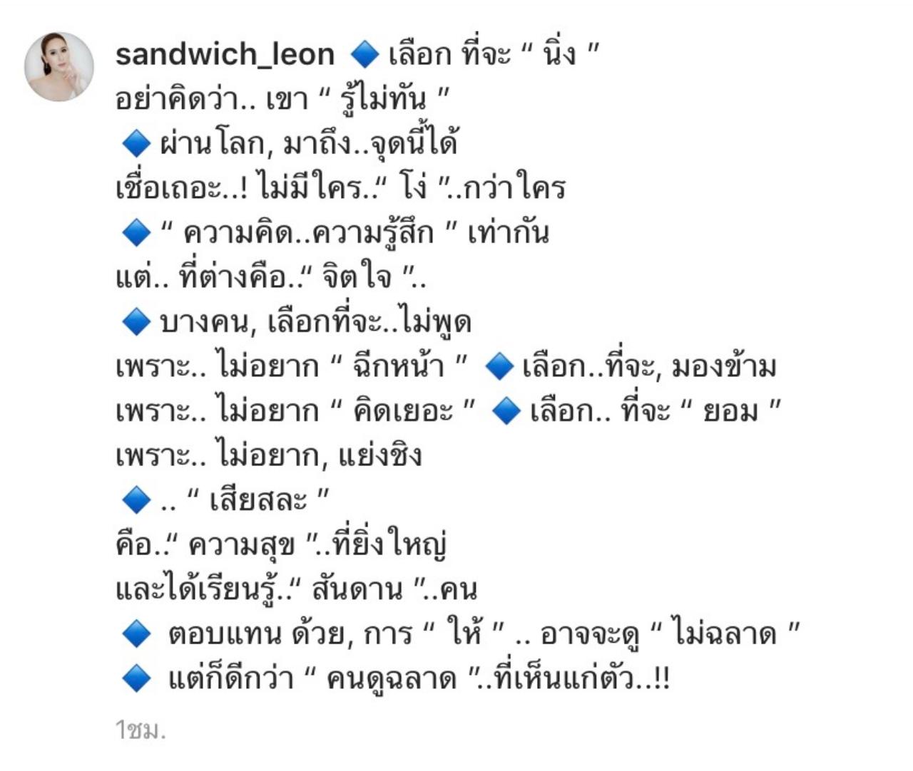 และล่าสุด เจ้าตัวได้โพสต์รูปพร้อมแคปชั่นคำคมลงในอินสตาแกรมของตัวเองโดยข้อความที่แซนวิชโพสต์มีดังนี้