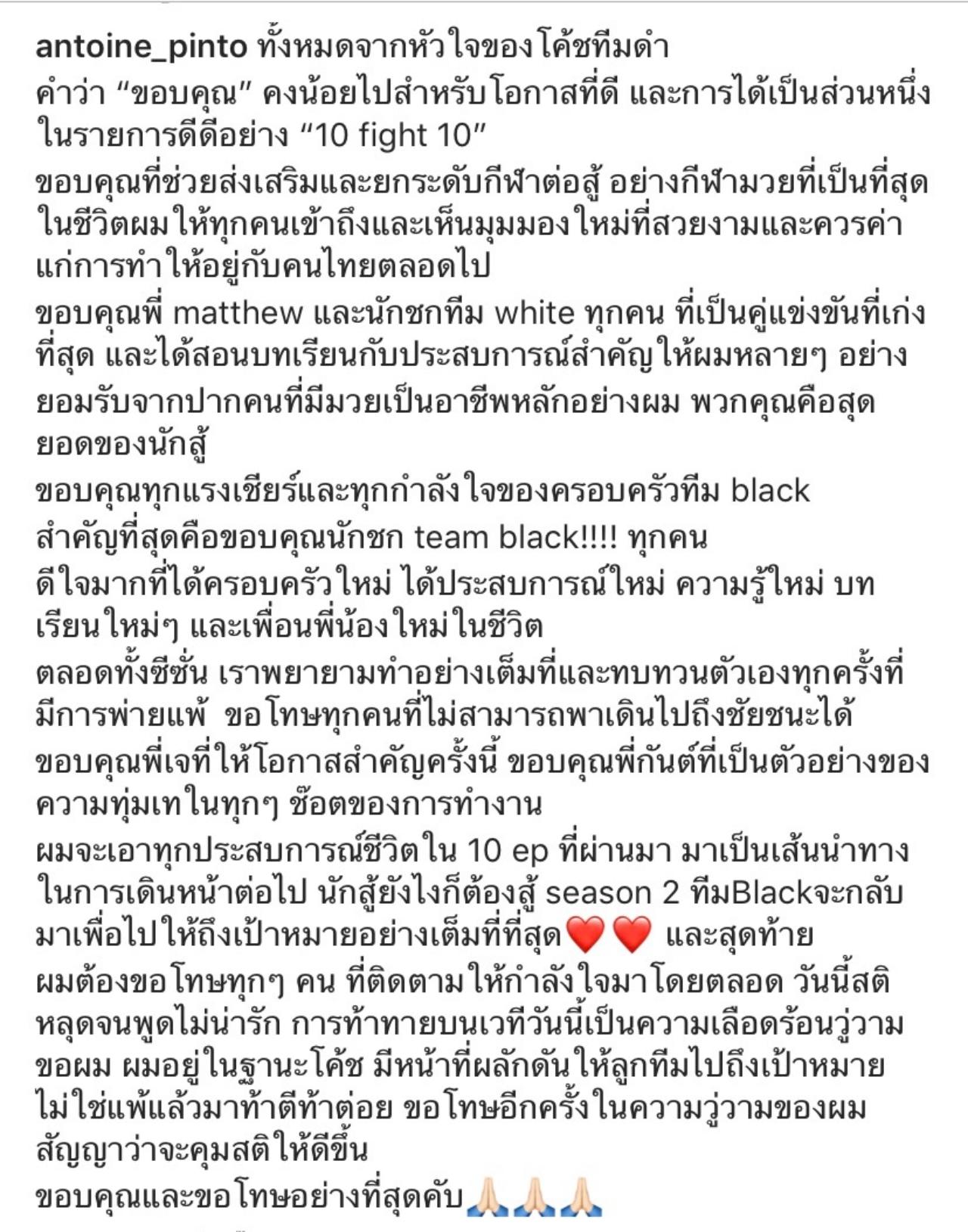 มวยจบแต่คนไม่จบ เพราะ อองตวน ปินโต โค้ชทีมแบล็กในรายการ 10 fight 10 ของขึ้นถึงกับประกาศท้าชก 3 รุม 1 และจะขอใช้มือซ้ายข้างเดียว ทำเอาชาวเน็ตพากันรุมวิจารณ์ว่าหนุ่มอองตวนแพ้แล้วพาล ล่าสุดเจ้าตัวได้โพสต์ข้อความลงในอินสตาแกรมของตัวเองว่า