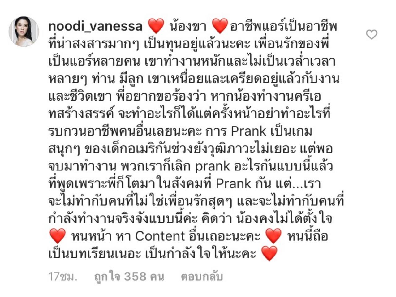 ที่พูดเพราะพี่ก็โตมาในสังคมที่ Prank กัน แต่...เราจะไม่ทำกับคนที่ไม่ใช่เพื่อนรักสุดๆ และจะไม่ทำกับคนที่กำลังทำงานจริงจังแบบนี้ค่ะ คิดว่าน้องคงไม่ได้ตั้งใจ หนหน้าหา Content อื่นเถอะนะคะ หนนี้ถือเป็นบทเรียนเนอะ เป็นกำลังใจให้นะคะ”