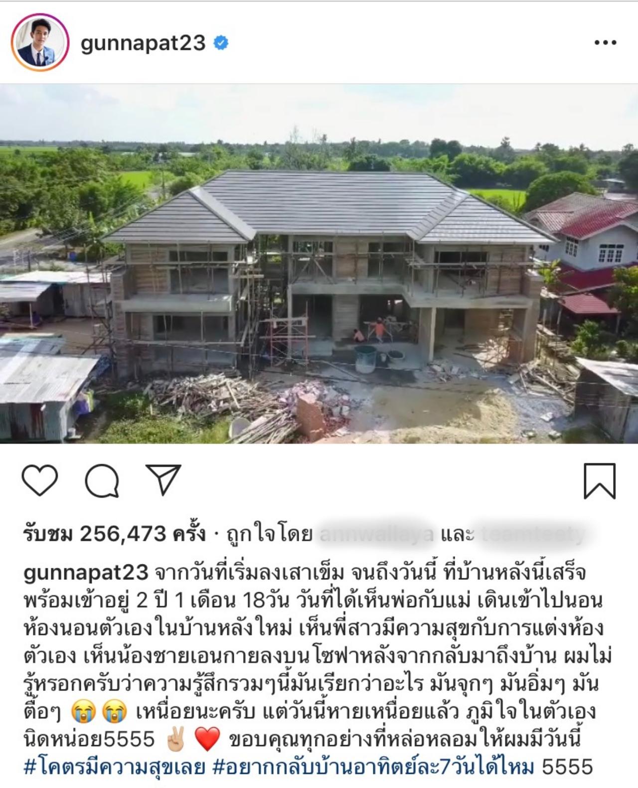 “จากวันที่เริ่มลงเสาเข็ม จนถึงวันนี้ ที่บ้านหลังนี้เสร็จพร้อมเข้าอยู่ 2 ปี 1 เดือน 18 วัน วันที่ได้เห็นพ่อกับแม่เดินเข้าไปนอนห้องนอนตัวเองในบ้านหลังใหม่ เห็นพี่สาวมีความสุขกับการแต่งห้องตัวเอง เห็นน้องชายเอนกายลงบนโซฟาหลังจากกลับมาถึงบ้าน ผมไม่รู้หรอกครับว่าความรู้สึกรวมๆนี้มันเรียกว่าอะไร มันจุกๆ มันอิ่มๆ มันตื้อๆ เหนื่อยนะครับ แต่วันนี้หายเหนื่อยแล้ว ภูมิใจในตัวเองนิดหน่อย5555 ขอบคุณทุกอย่างที่หล่อหลอมให้ผมมีวันนี้ #โคตรมีความสุขเลย #อยากกลับบ้านอาทิตย์ละ7วันได้ไหม 5555”