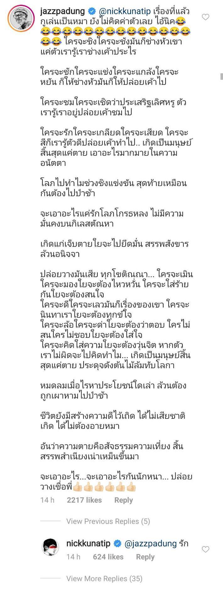 ซึ่งจากเรื่องนี้ทำให้กลายเป็นที่วิพากษ์วิจารณ์อย่างหนักในวงกว้าง บ้างก็บอกให้ทั้งคู่ใจเย็นๆ นอกจากนี้ยังมีนักแสดงตลกหนุ่ม แจ๊ส ชวนชื่น ก็ได้แสดงความคิดเห็นถึงเรื่องนี้ว่า “เรื่องที่แล้ว กูเล่นเป็นหมา ยังไม่คิดค่าตัวเลย ไอ้นิค” จากนั้นก็พิมพ์เนื้อเพลงยาวเหยียดที่บอกว่าไม่ว่าใครจะเป็นยังไงก็ให้ปล่อยเขาไป ก่อนจะปิดท้ายด้วยการบอกว่า “ปล่อยวางเชื่อพี่” และนิกก็ตอบกลับไปว่า "รัก" ด้วย.