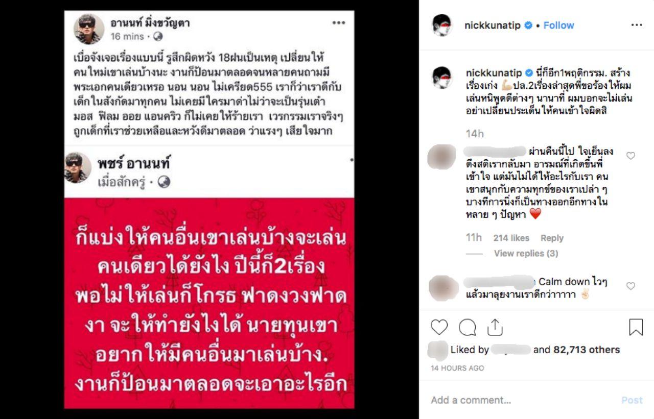 งานนี้พอหนุ่มนิกเห็นข้อความดังกล่าว เจ้าตัวโพสต์ภาพข้อความตัวเองที่เขียนว่า “ผมขอโทษทุกๆ คนด้วยนะครับที่อาจจะใช้วาจาที่ไม่ดีหรือไม่เหมาะสม ขอโทษจากใจครับ แต่ว่าผมเเค่ไม่อยากให้เรื่องที่พี่เค้าแต่งขึ้นมาทำให้ทุกคนเข้าใจผิด ผมไม่เคยไปขอหนังเล่นหรือไม่พอใจเวลาจะให้คนอื่นเล่น เอาจริงๆ ผมยังเคยบอกกับทีมงานเลยว่า ผมว่าไห้ผมพักแล้วเปลี่ยนคนอื่นมาแทนบ้างกลัวคนเบื่อเพราะฉะนั้นผมจึงโกรธ ผมขอโทษอีกครั้งครับ เเค่ที่พี่เค้าพูดมันไม่เป็นความจริงเท่านั้นเองครับ” พร้อมทั้งบอกว่า “ผมเสียความรู้สึกไปหมดแล้วครับ หยุดแต่งเรื่องทำร้ายผมสักที”