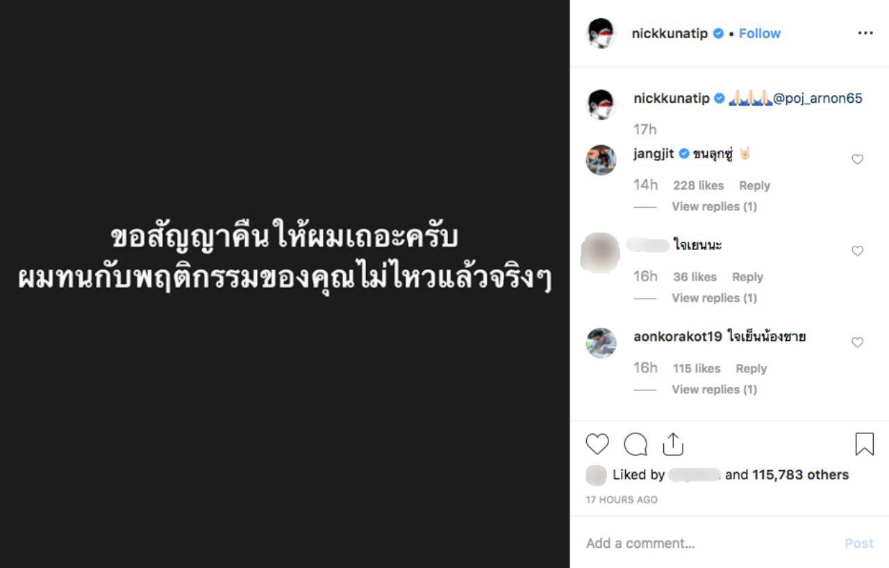 เปิดศึกดราม่ารัวๆ ผ่านโซเชียลแล้วจ้าสำหรับนักแสดงหนุ่ม นิก คุณาธิป ปิ่นประดับ หนุ่มรุ่นน้องคนสนิทของนักแสดงสาว แตงโม นิดา และผู้กำกับหนังชื่อดัง พชร์ อานนท์ เมื่อนิกโพสต์ข้อความลงไอจีว่า “ขอสัญญาคืนให้ผมเถอะครับ ผมทนกับพฤติกรรมของคุณไม่ไหวแล้วจริงๆ” พร้อมทั้งแท็กไปที่ไอจีของพชร์ ทำเอาหลายคนตกอกตกใจ เพราะไม่รู้ว่าอะไรที่ทำให้เจ้าตัวตัดสินใจโพสต์แบบนี้ บ้างก็บอกให้ใจเย็นๆ