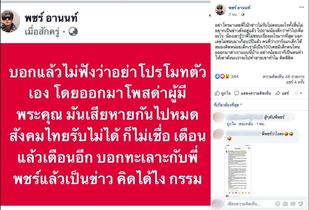 ซึ่งโพสต์ดังกล่าวของนิกเกิดขึ้นหลังจากที่พชร์เองก็โพสต์ภาพข้อความ “จะนินทาอะไรให้คิดถึงตอนที่พึ่งพากันด้วยนะคะ ขอบคุณค่ะ” และเขียนแคปชั่นว่า “เห็นคนอื่นดีกว่าคนใกล้ตัว คนประเภทนี้มีเยอะ ไม่เห็นบุญคุณเขา ก็อย่าเอาเขาไปนินทาหรือด่าลับหลังไม่เจริญหรอก สัตว์จะทำ จริงๆ”