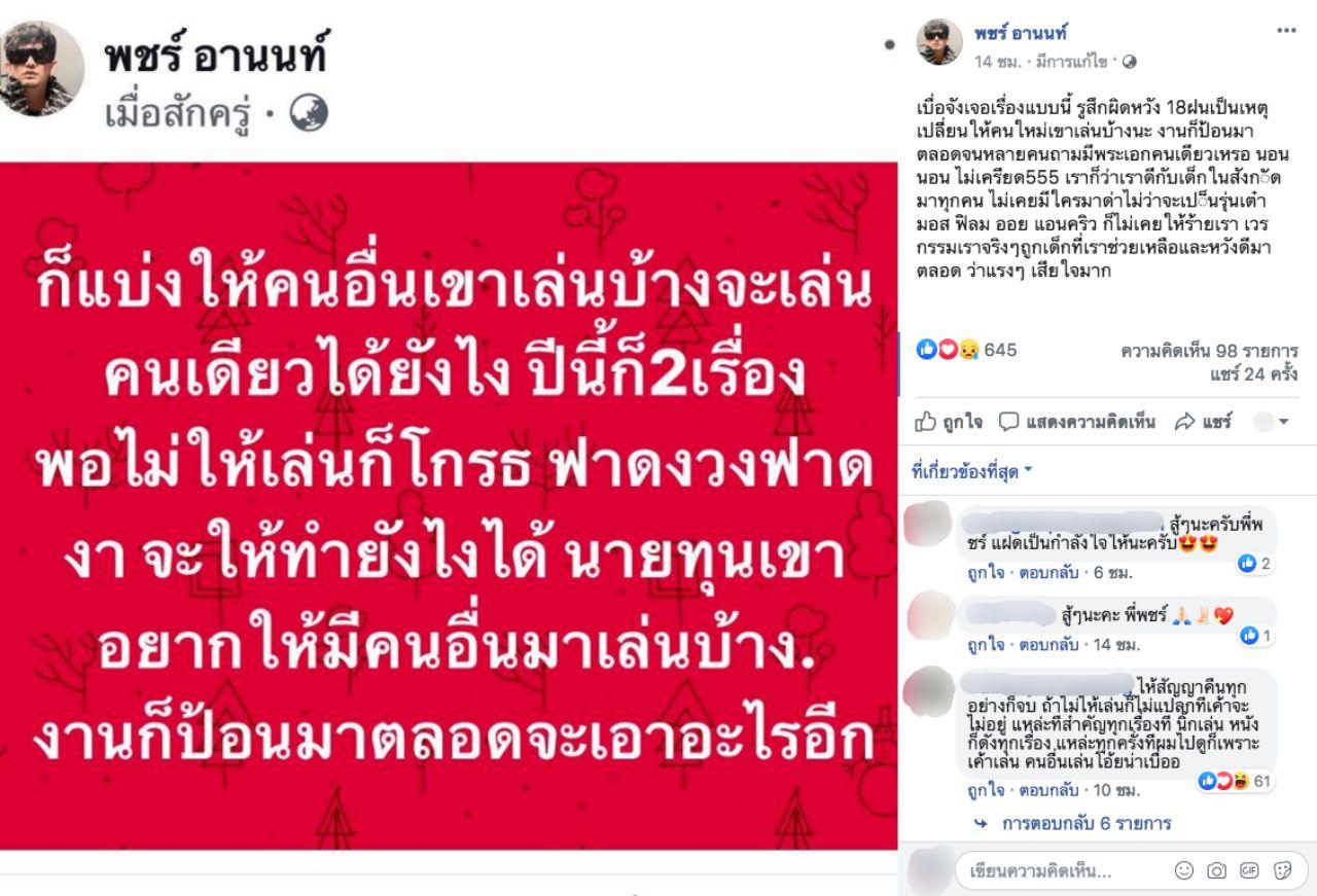 และเมื่อนิกโพสต์ข้อความดังกล่าว งานนี้พชร์เลยโต้กลับด้วยภาพข้อความว่า “ก็แบ่งให้คนอื่นเขาเล่นบ้าง จะเล่นคนเดียวได้ยังไง ปีนี้ก็ 2 เรื่อง พอไม่ให้เล่นก็โกรธ ฟาดงวงฟาดงา จะให้ทำยังไงได้ นายทุนเขาอยากให้มีคนอื่นมาเล่นบ้าง งานก็ป้อนมาตลอดจะเอาอะไรอีก” และเขียนข้อความบรรยายภาพว่า “เบื่อจังเจอเรื่องแบบนี้ รู้สึกผิดหวัง 18 ฝนเป็นเหตุ เปลี่ยนให้คนใหม่เขาเล่นบ้างนะ งานก็ป้อนมาตลอดจนหลายคนถามมีพระเอกคนเดียวเหรอ นอน นอน ไม่เครียด 555 เราก็ว่าเราดีกับเด็กในสังกัดมาทุกคน ไม่เคยมีใครมาด่า ไม่ว่าจะเป็นรุ่นเต๋า มอส ฟิล์ม ออย แอนดริว ก็ไม่เคยให้ร้ายเรา เวรกรรมเราจริงๆ ถูกเด็กที่เราช่วยเหลือและหวังดีมาตลอดว่าแรงๆ เสียใจมาก”