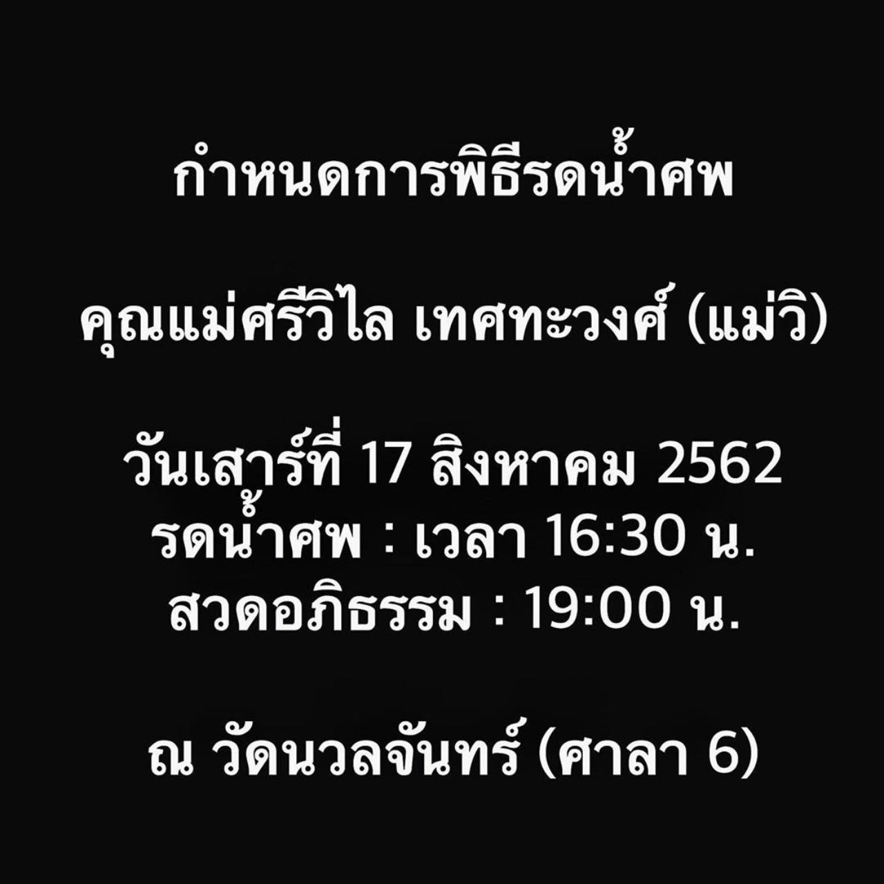 สำหรับกำหนดการสวดอภิธรรม คุณแม่ศรีวิไล เทศทะวงศ์ จะมีตั้งแต่วันที่ 17-23 สิงหาคม 2562 ในช่วงเวลา 19.00 น. ของทุกวัน ที่วัดนวลจันทร์ ศาลา 6 และจะมีพิธีฌาปนกิจ ในวันที่ 24 สิงหาคม 2562 เวลา 16.00 น.