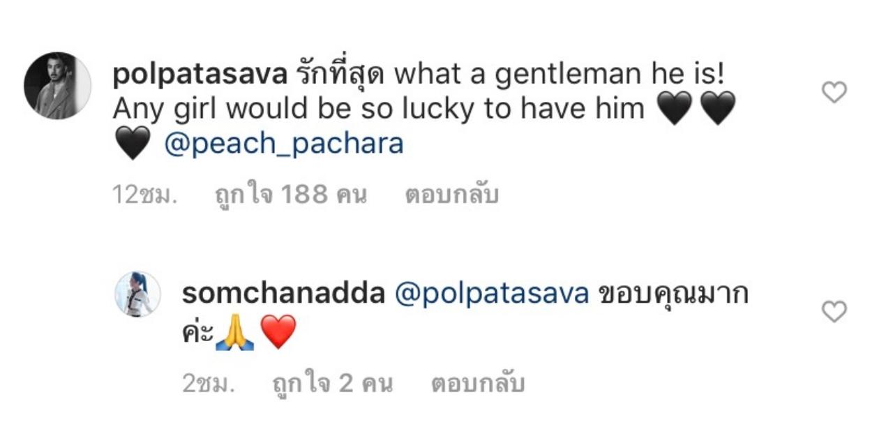 “รักที่สุด what a gentleman he is! Any girl would be so lucky to have him @peach_pachara” (รักที่สุด เขาเป็นสุภาพบุรุษ ผู้หญิงคนไหนจะโชคดีที่ได้เขามาเป็นแฟน)