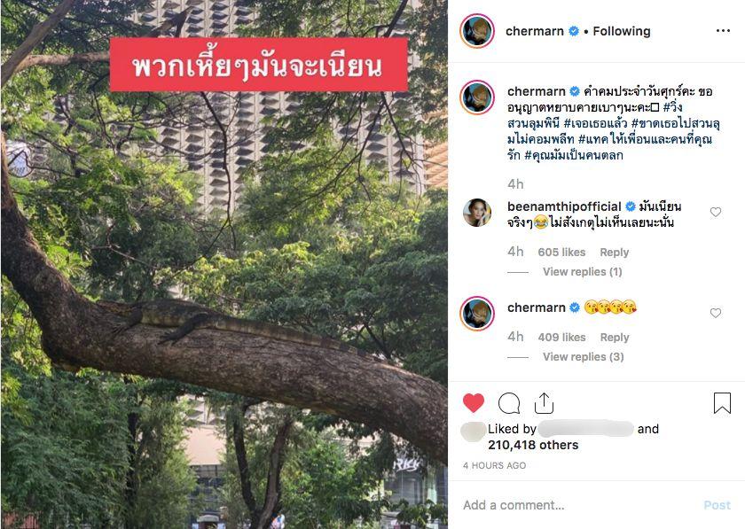 ส่วนแคปชั่นที่เขียนในรูปบอกเลยแซ่บจริงๆ เพราะเขียนไว้ว่า “พวกเหี้_ๆ มันจะเนียน” และเขียนแคปชั่นบรรยายใต้รูปว่า “คำคมประจำวันศุกร์ค่ะ ขออนุญาตหยาบคายเบาๆ นะคะ #วิ่งสวนลุมพินี #เจอเธอแล้ว #ขาดเธอไปสวนลุมไม่คอมพลีท #แทคให้เพื่อนและคนที่คุณรัก #คุณมัมเป็นคนตลก”