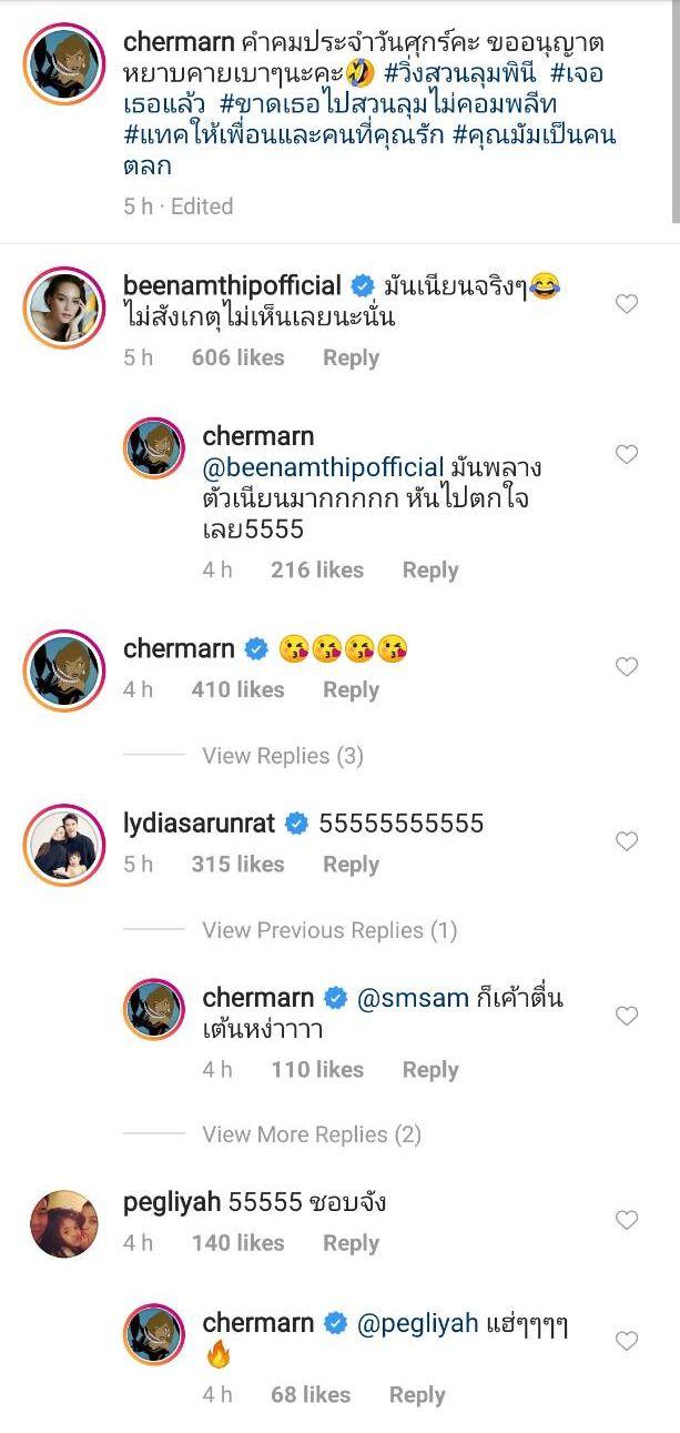 ก็ไม่รู้ว่านางเอกสาวจะสื่อถึงอะไร หรือแค่โพสต์เอาฮาเพราะเจอตัวเงินตัวทองจริงๆ ครั้งแรก แต่ที่แน่ๆ แฟนๆ เข้ามาคอมเมนต์ขำกันเพียบ เพราะภาพและแคปชั่นมันจี๊ดโดนใจดีเหลือเกิน ส่วนคนดังในวงการบันเทิงก็มาคอมเมนต์กันหลายคน อาทิ บี น้ำทิพย์, ลีเดีย ศรัณย์รัชต์, เป๊ก สัญชัย, ดุ๊ก ภาณุเดช, สู่ขวัญ บูลกูล, น้ำฝน ทวีพร, นาว ทิสานาฏ, มัดหมี่ พิมพ์ดาว, กีตาร์ ศิริพิชญ์, จีน่า เดอะเฟซ, ฟลุค เกริกพล, หญิงแย้ นนทพร ฯลฯ.