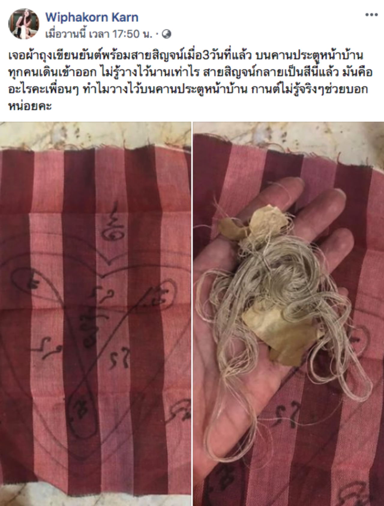 ล่าสุด กานต์ ก็ได้โพสต์เฟซบุ๊ก Wiphakorn Karn ถึงเรื่องพวกนี้ โดยระบุว่า ได้เจอผ้าถุงเขียนยันต์ พร้อมสายสิญจน์ บนคานประตูหน้าบ้าน ไม่รู้วางไว้นานเท่าไร พร้อมตั้งคำถามว่ามันคืออะไร ทำไมวางไว้บนคานประตูหน้าบ้านที่ทุกคนเดินเข้าออก โดยลักษณะของผ้ายันต์นั้นได้มีการวาดรูปหัวใจและลงอักขระไว้ด้วย และ กานต์ ยังได้โพสต์ต่ออีกว่า น่าจะเป็นยันต์หัวใจขุนแผน ซึ่งเป็นประเภทยันต์มหาเสน่ห์ พร้อมกับบอกข้อมูลเพิ่มว่า ยันต์นะอกแตก สุดยอดยันต์มหาเสน่ห์ คล้ายกับพระขุนแผนกำกับด้วยคาถานะอกแตก ซึ่งหากภาวนาอธิษฐานเรียกแล้วผู้นั้นไม่มาหา ก็จะถวิลหาจนอกแทบแตกตาย