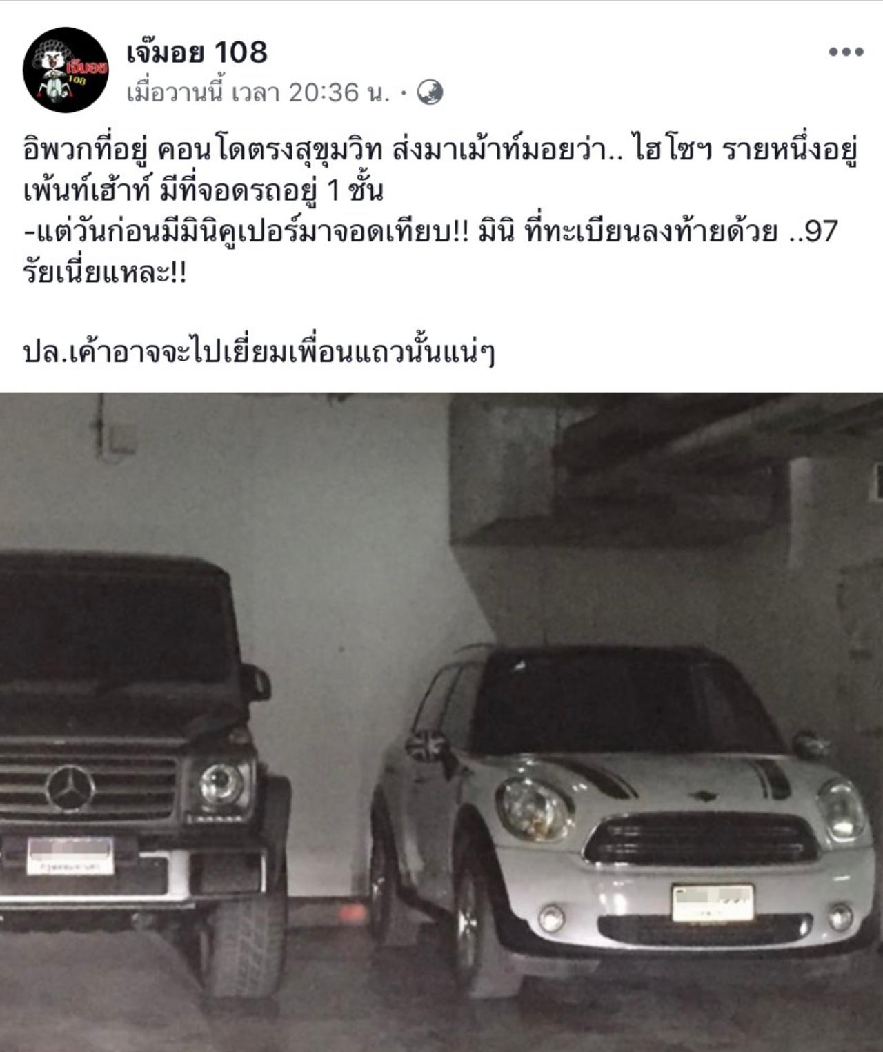 ช่วงนี้คงเป็นช่วงพระศุกร์เข้าพระเสาร์แทรกของนางเอกสาววัยละอ่อน แพทริเซีย กู๊ด ที่จะทำอะไรก็ถูกจับตามอง และล่าสุดเจ้าตัวก็ถูกชาวเน็ตโยงอีกแล้ว เมื่อเพจดังเจ๊มอย108 ได้โพสต์ภาพรถมินิคันนึงที่มีคนส่งเข้ามาให้มาโพสต์ลงเพจ พร้อมข้อความว่า คนที่อยู่คอนโดแถวสุขุมวิท บอกว่าไฮโซรายหนึ่งอยู่เพนต์เฮาส์ที่มีชั้นจอดรถอยู่ 1 ชั้น และเห็นมินิคูเปอร์มาจอดเทียบ มินิที่มีทะเบียนลงท้ายด้วย..97 ก่อนจะทิ้งท้ายว่าอาจจะไปเยี่ยมเพื่อนแถวๆ นั้น