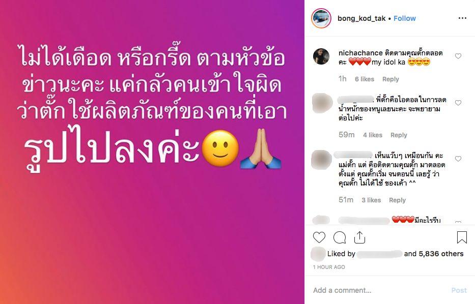 โดยมีแฟนๆ เข้ามาคอมเมนต์ให้กำลังใจ พร้อมทั้งบอกว่าให้เจ้าตัวแจ้งความลงบันทึกประจำวันด้วย จากนั้นตั๊กโพสต์ภาพข้อความอีกว่า “ไม่ได้เดือดหรือกรี๊ดตามหัวข้อข่าวนะคะ แค่กลัวคนเข้าใจผิดว่าตั๊กใช้ผลิตภัณฑ์ของคนที่เอารูปไปลงค่ะ”
