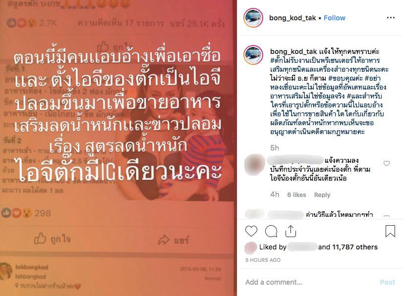 โดยตั๊กได้โพสต์ภาพตัวเองและน้องข้าวหอม ลูกชาย ที่ถูกนำไปแอบอ้างขายอาหารเสริม และเขียนข้อความในภาพว่า “ตอนนี้มีคนแอบอ้างเพื่อเอาชื่อและตั้งไอจีของตั๊กเป็นไอจีปลอมขึ้นมาเพื่อขายอาหารเสริมลดน้ำหนักและข่าวปลอมเรื่องสูตรลดน้ำหนัก ไอจีตั๊กมี IG เดียวนะคะ” พร้อมทั้งเขียนแคปชั่นในไอจีว่า “เเจ้งให้ทุกคนทราบค่ะ #ตั๊กไม่รับงานเป็นพรีเซนเตอร์ให้อาหารเสริมทุกชนิดและเครื่องสำอางทุกชนิดนะคะ ไม่ว่าจะมี อย. ก็ตาม #ขอบคุณค่ะ #อย่าหลงเชื่อนะคะไม่ใช่ข้อมูลที่อัพเดตและเรื่องอาหารเสริมไม่ใช่ข้อมูลจริง #และสำหรับใครที่เอารูปตั๊กหรือข้อความนี้ไปแอบอ้างเพื่อใช้ในการขายสินค้าใดใดเกี่ยวกับผลิตภัณฑ์ลดน้ำหนักหากพบเห็นจะขออนุญาตดำเนินคดีตามกฎหมายค่ะ”