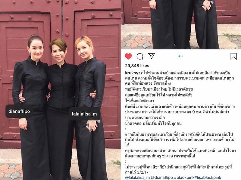 ซึ่งครูก้อยที่ชาวเน็ตคนดังกล่าวหมายถึงคือ ครูก้อย สุภาพรรณ หรือ ครูก้อย เอเอฟ ที่เคยเป็น Voice Trainer ให้กับเหล่านักล่าฝันเวทีเอเอฟ 10 11 และ 12 โดยครูก้อยได้โพสต์ภาพตนเองกับลิซ่าและเดียร์น่าเมื่อครั้งที่เดินทางไปกราบพระบรมศพในหลวงรัชกาลที่ 9 ซึ่งในช่วงนั้นลิซ่ายังเป็นศิลปินฝึกหัดค่าย YG พร้อมทั้งเขียนข้อความเล่าถึงเหตุการณ์ครั้งนั้นว่า “ไปทำงานต่างบ้านต่างเมือง แต่ไม่เคยลืมว่าตัวเองเป็นคนไทย ความตั้งใจคือจะต้องมากราบพระบรมศพ เหมือนคนไทยทุกคนที่รักพ่อหลวง รัชกาลที่ ๙ พอมีจังหวะรีบมาเมืองไทย ไม่มีเวลาตัดชุด คุณแม่ซื้อชุดเตรียมไว้ให้ หลวมไม่พอดีตัว ใช้เข็มกลัดติดเอา