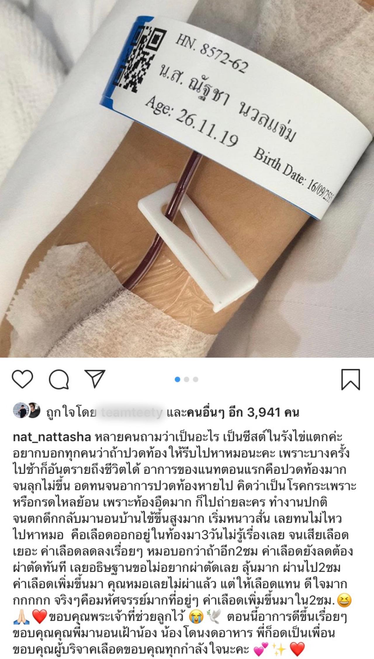 “หลายคนถามว่าเป็นอะไร เป็นซีสต์ในรังไข่แตกค่ะ อยากบอกทุกคนว่าถ้าปวดท้องให้รีบไปหาหมอนะคะ เพราะบางครั้งไปช้าก็อันตรายถึงชีวิตได้ อาการของแนทตอนแรกคือปวดท้องมาก จนลุกไม่ขึ้น อดทนจนอาการปวดท้องหายไป คิดว่าเป็นโรคกระเพาะ หรือกรดไหลย้อน เพราะท้องอืดมาก