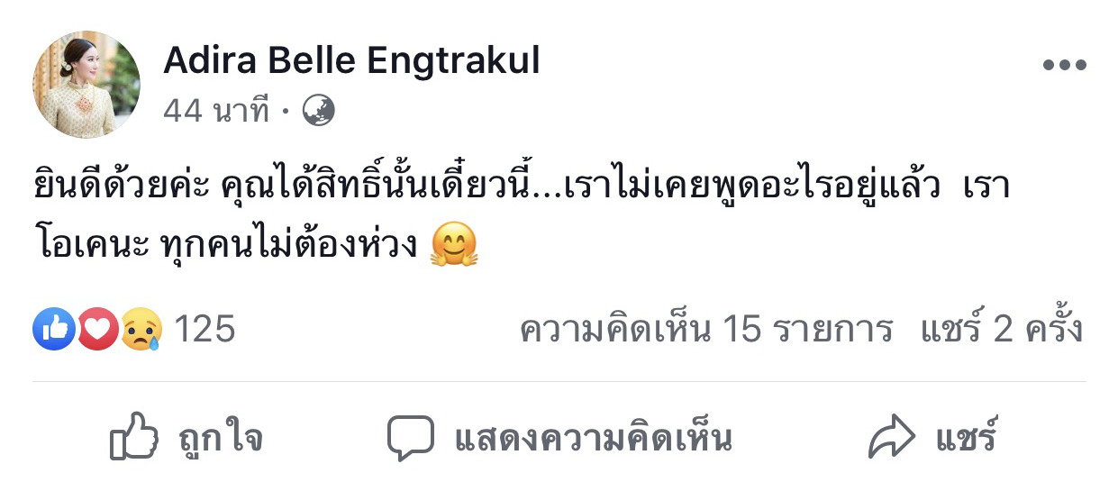 แต่ล่าสุด เบลล์ อดิราภ์ ก็ได้โพสต์ข้อความผ่านทางเฟซบุ๊กส่วนตัว Adira Belle Engtrakul ว่า “ยินดีด้วยค่ะ คุณได้สิทธิ์นั้นเดี๋ยวนี้...เราไม่เคยพูดอะไรอยู่แล้ว เราโอเคนะ ทุกคนไม่ต้องห่วง” โดยมีชาวเน็ตเข้าไปคอมเมนต์ให้กำลังใจเป็นจำนวนมาก และขอให้เข้มแข็งด้วย