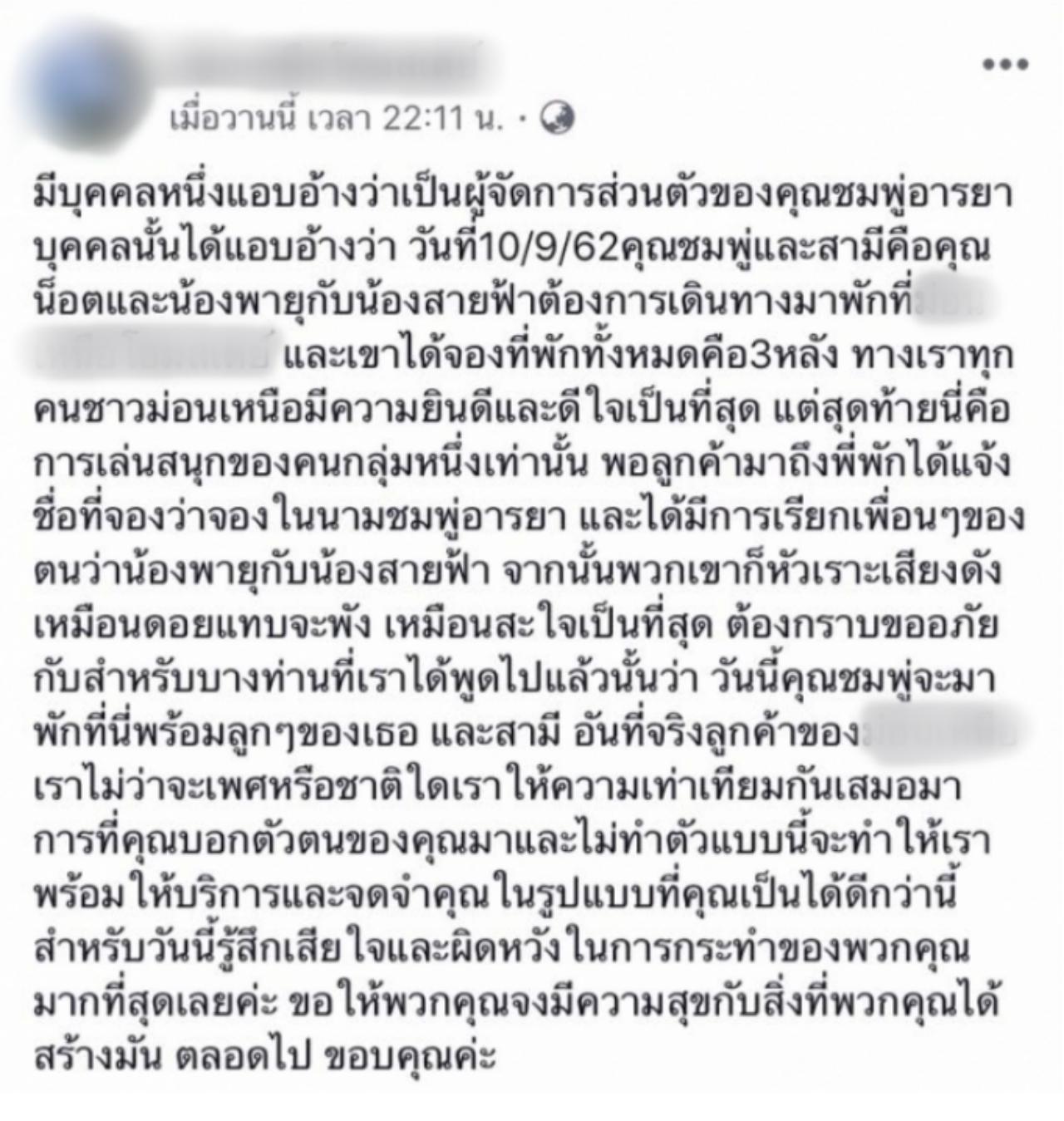 แต่เป็นบุคคลอื่น โดยเอาชื่อของ ชมพู่ อารยา มาแอบอ้างเพื่อจองห้องพักเท่านั้น ซึ่งเจ้าของโฮมสเตย์ได้โพสต์ข้อความนี้เพราะรู้สึกผิดหวังและเสียใจกับเหตุการณ์ที่เกิดขึ้นและอยากจะบอกกับบุคคลกลุ่มนี้ว่าไม่จำเป็นจะต้องใช้ชื่อของคนดังมาแอบอ้างเพราะอยากจะได้รับบริการที่ดี เนื่องจากโฮมสเตย์ให้บริการทุกคนในมาตรฐานเดียวกันอยู่แล้ว