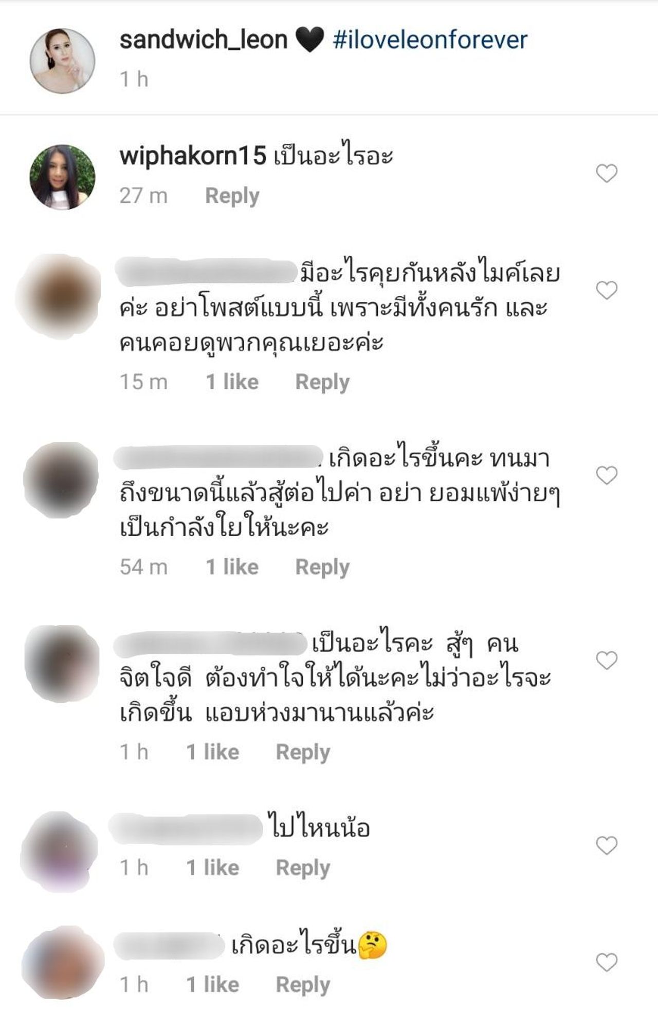 โดยส่วนใหญ่จะเข้ามาให้กำลังใจ แซนวิช และบอกว่าให้สู้ๆ บ้างก็บอกว่าทนมาถึงขนาดนี้แล้วขอให้สู้ต่อไป อย่ายอมแพ้ง่ายๆ บางคนก็บอกว่าไม่ว่าอะไรจะเกิดขึ้นก็ขอให้ทำใจให้ได้ และรู้สึกเป็นห่วงมานานแล้ว บ้างก็เข้ามาถามว่าเกิดอะไรขึ้น ใจคอไม่ดีเลยที่เห็นโพสต์แบบนี้ บางคนก็แสดงความคิดเห็นว่ามีอะไรให้คุยกันหลังไมค์ดีกว่า อย่าโพสต์แบบนี้ เพราะมีทั้งคนรักและคนที่คอยดูอยู่เยอะ ฯลฯ