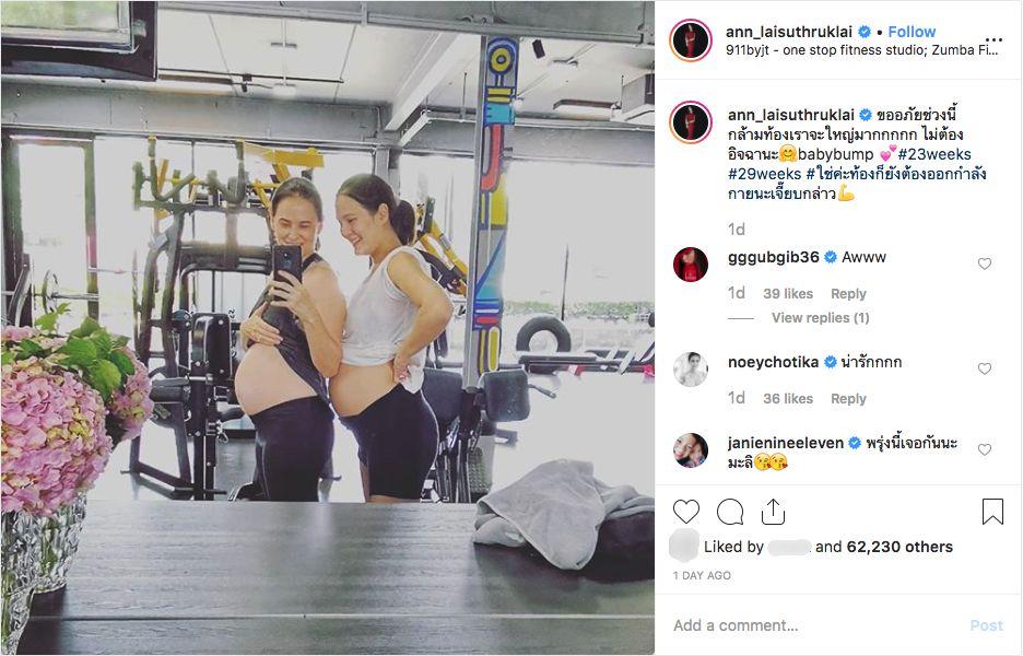 โดย แอน โพสต์ภาพคู่กับ เจนี่ ขณะไปออกกำลังกายที่ฟิตเนสด้วยกัน พร้อมทั้งเขียนแคปชั่นว่า “ขออภัย ช่วงนี้กล้ามท้องเราจะใหญ่มากกกกก ไม่ต้องอิจฉานะ babybump #23weeks #29weeks #ใช่ค่ะท้องก็ยังต้องออกกำลังกายนะเจี๊ยบกล่าว”
