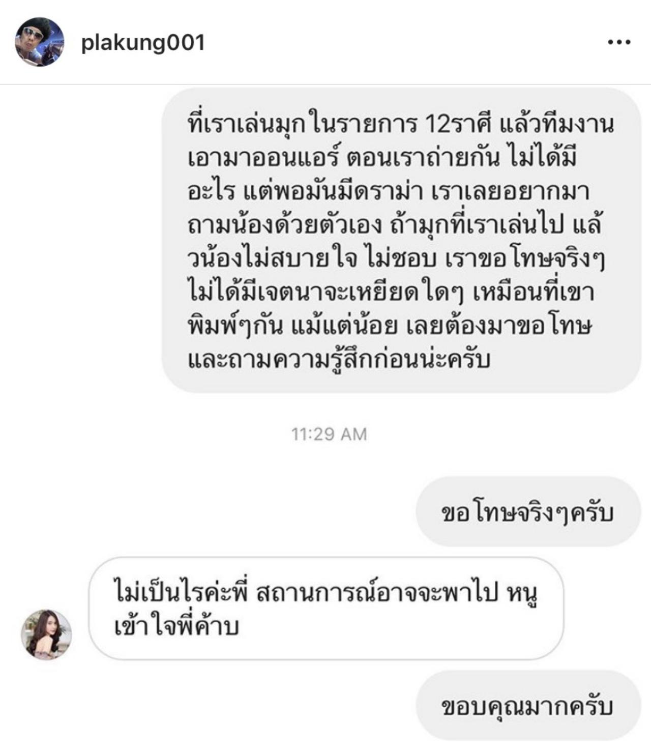 และล่าสุด เจ้าตัวก็ได้โพสต์ข้อความที่ไดเรกไปหา โยชิ รินรดา โดยมีข้อความสนทนาประมาณว่า ที่ตนเองเล่นมุกในรายการ แล้วทีมงานเอามาออกอากาศ ตอนถ่ายไม่ได้คิดอะไร แต่พอออกอากาศแล้วมีดราม่า อยากถามว่าถ้ามุกที่เล่นไป แล้วทำให้ไม่สบายใจ ไม่ชอบ ตนขอโทษจริงๆ ไม่ได้มีเจตนาจะเหยียดใดๆ เหมือนที่หลายคนคิดเลย อยากจะขอโทษและถามความรู้สึก ซึ่งอีกฝ่ายก็บอกว่าไม่เป็นไร สถานการณ์อาจจะพาไป ตนเองเข้าใจอีกฝ่าย