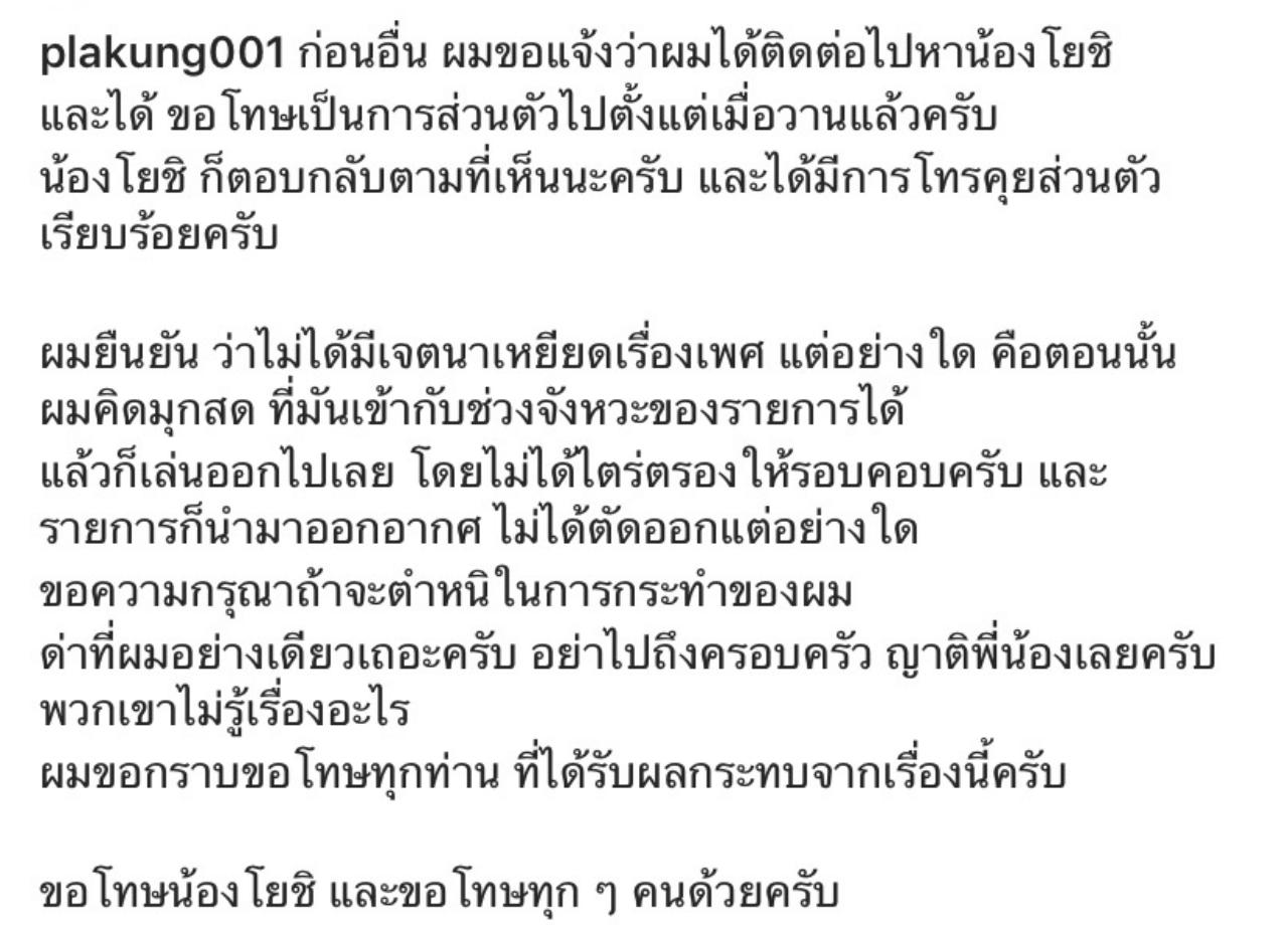 ขอความกรุณาถ้าจะตำหนิในการกระทำของผม ด่าที่ผมอย่างเดียวเถอะครับ อย่าไปถึงครอบครัว ญาติพี่น้องเลยครับ พวกเขาไม่รู้เรื่องอะไร ผมขอกราบขอโทษทุกท่าน ที่ได้รับผลกระทบจากเรื่องนี้ครับ ขอโทษน้องโยชิ และขอโทษทุกๆ คนด้วยครับ”