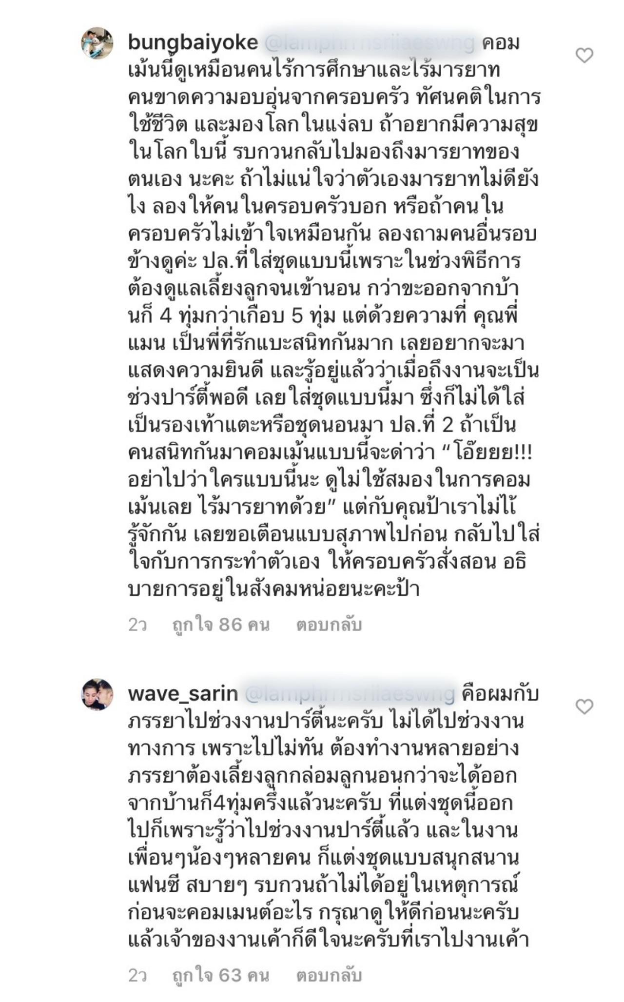 และนอกจากนี้ สามีหนุ่ม เวฟ สาริน ก็ได้เข้ามาคอมเมนต์ชี้แจงช่วยภรรยาอีกเสียงว่า ตนกับภรรยาไปงานช่วงที่ปาร์ตี้ ไม่ได้ไปช่วงที่เป็นทางการ ในงานเพื่อนๆ น้องๆ ก็แต่งชุดแบบสนุกสนานแฟนซี สบายๆ ถ้าไม่ได้อยู่ในเหตุการณ์ก่อนจะคอมเมนต์ขอให้ดูให้ดีก่อน.