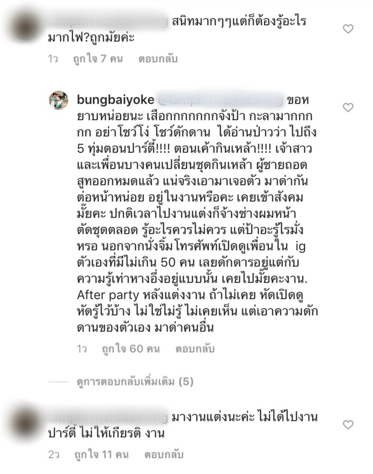 ทำเอา บุ้ง สะธี ภรรยาของ เวฟ สาริน ถึงกับเดือดปุดๆ จนต้องตอบกลับแบบเจ็บจี๊ดอ่านแล้วมีสะอึกหน้าหงาย เมื่อมีชาวเน็ตคนนึงเข้ามาคอมเมนต์ติงถึงการแต่งตัวของสาวบุ้งที่เจ้าตัวใส่ไปร่วมงานแต่งของ ใบเตย อาร์สยาม และดีเจแมน พัฒนพล โดยชาวเน็ตได้บอกว่า ถึงจะสนิทกันมาก แต่ก็ต้องรู้ว่าอะไรควร และบอกว่ามางานแต่งไม่ได้มางานปาร์ตี้