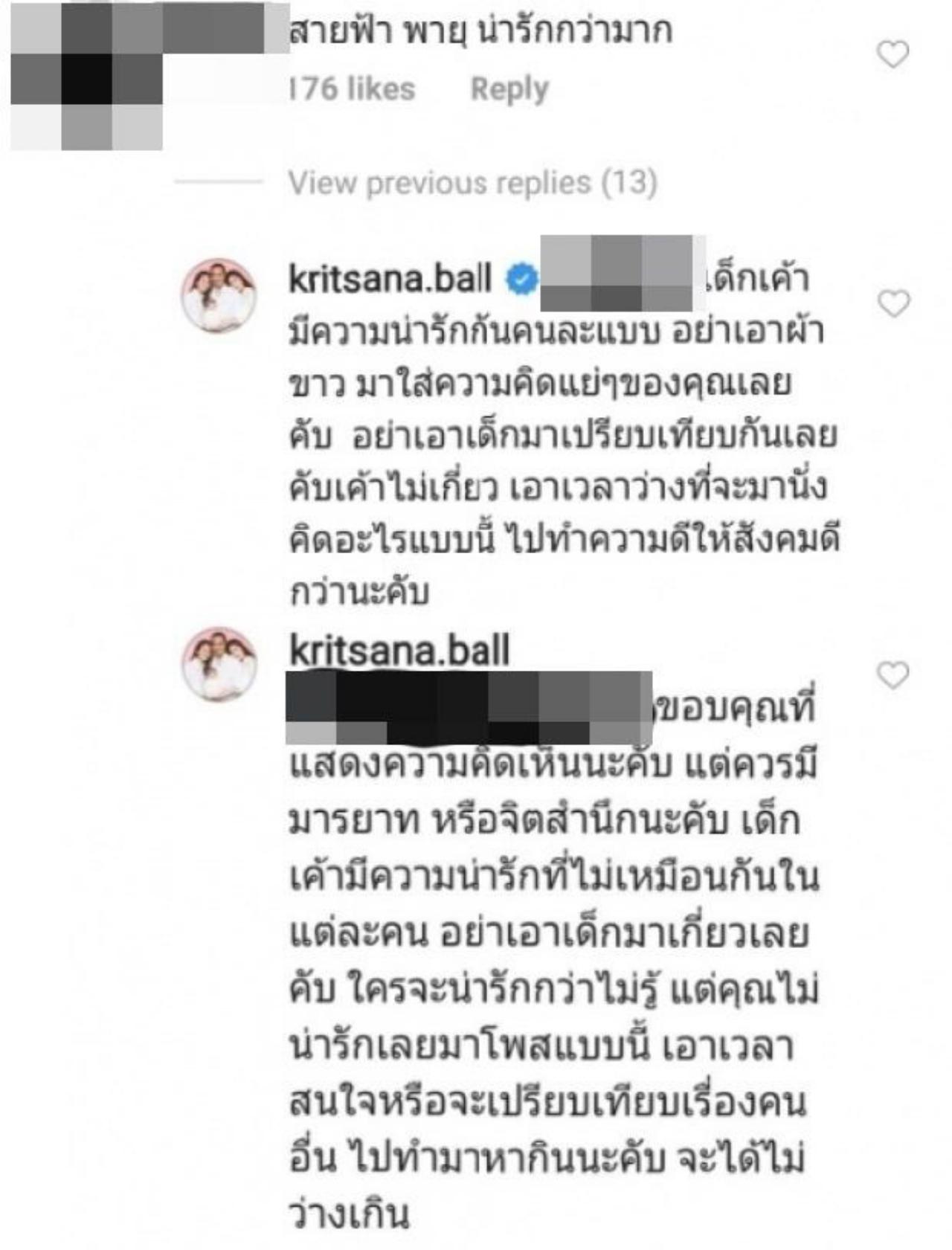 โดยมีชาวเน็ตรายนึง ได้คอมเมนต์ว่า สายฟ้า พายุ น่ารักมากกว่า งานนี้ทำเอาคนเป็นพ่ออย่างหนุ่ม บอล กฤษณะ นิ่งเฉยไม่ได้ เลยเข้ามาคอมเมนต์ฉะกลับชาวเน็ตว่า “เด็กเค้ามีความน่ารักกันคนละแบบ อย่าเอาผ้าขาวมาใส่ความคิดแย่ๆ ของคุณเลยคับ อย่าเอาเด็กมาเปรียบเทียบกันเลยคับ เค้าไม่เกี่ยว เอาเวลาว่างที่จะมานั่งคิดอะไรแบบนี้ ไปทำความดีให้สังคมดีกว่านะคับ”