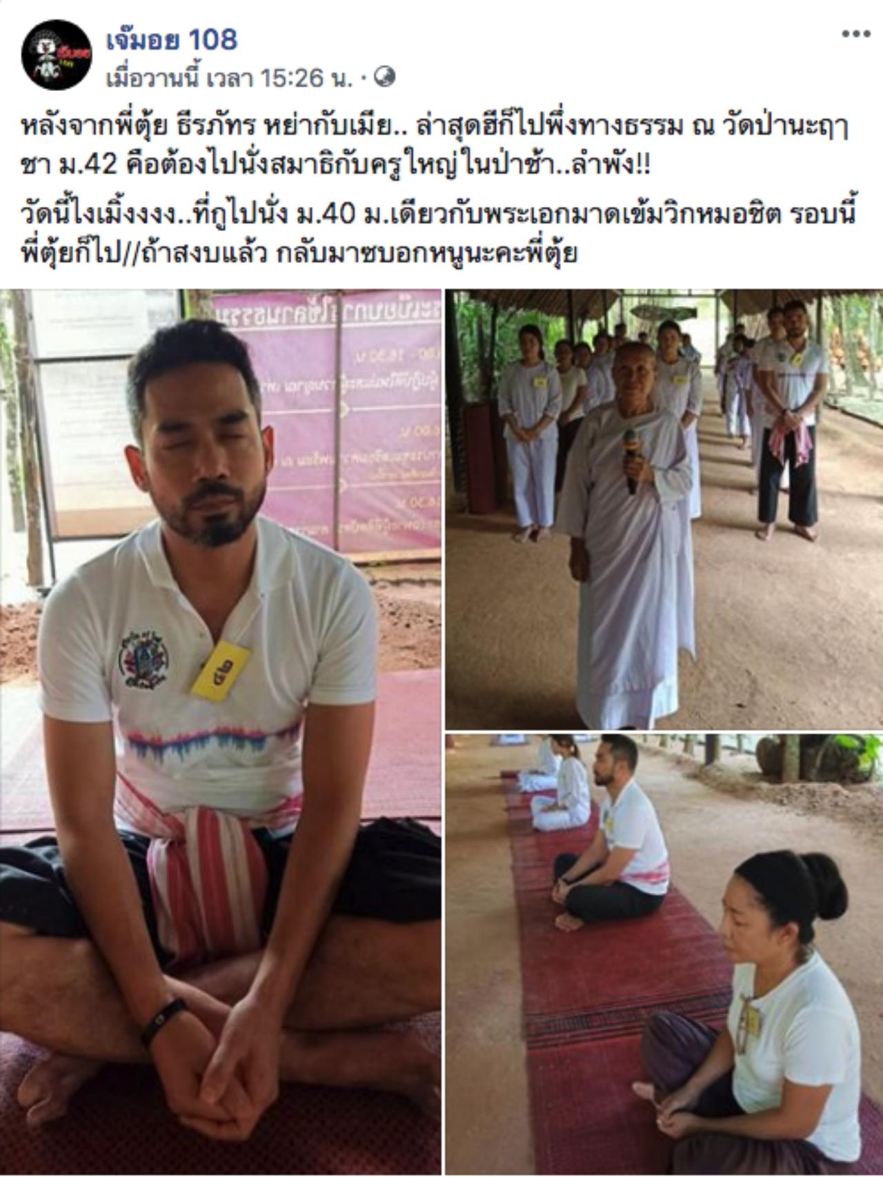 ล่าสุดใน เพจ เจ๊มอย 108 ก็ได้เผยภาพ ตุ้ย ธีรภัทร์ ที่ไว้หนวดไว้เคราสุดเข้ม กำลังนั่งฝึกสมาธิอยู่ที่วัดป่านะฤาชา จ.สระบุรี โดยได้เขียนบรรยายไว้ว่า "หลังจากพี่ตุ้ย ธีรภัทร์ หย่ากับเมีย.. ล่าสุดฮีก็ไปพึ่งทางธรรม ณ วัดป่านะฤาชา ม.42 คือต้องไปนั่งสมาธิกับครูใหญ่ในป่าช้า..ลำพัง!!