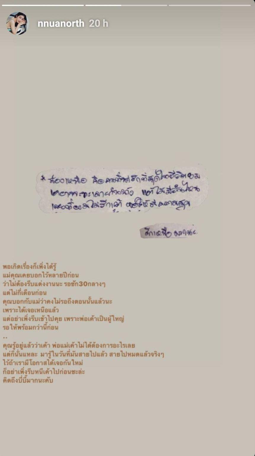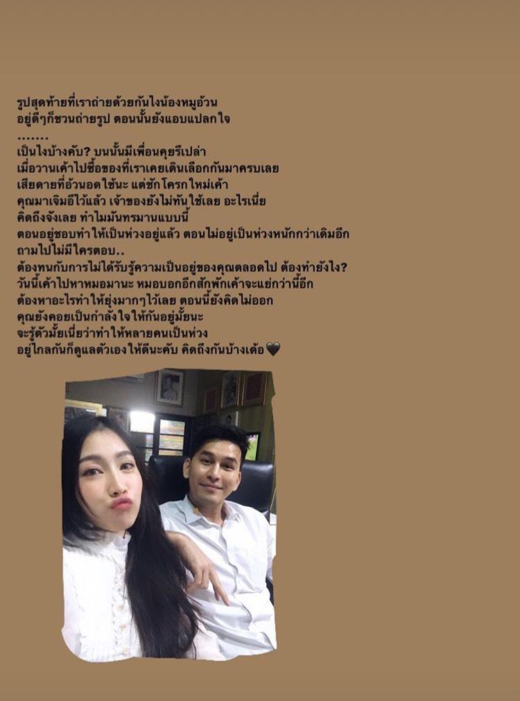 โดย น้องเหนือ โพสต์ภาพข้อความสนทนาทางไลน์และภาพคู่หวานๆ ลงในไอจีส่วนตัว และเขียนข้อความว่า “คิดถึงที่สุดเลยน้องหมูอ้วน ตอนนี้ทำอะไร อยู่ที่ไหน สบายดีรึเปล่า คิดถึงกันบ้างมั้ย” รวมถึงข้อความบอกรักกันและกันของทั้งคู่ และเขียนแคปชั่น “ไหนบอกจะไม่ทิ้งช้าน น้องหมูอ้วน ไหนบอกจะทะเลาะกันไปจนแก่ ถ้าทุกข์มากจะมายิ้ม มาชวนให้หัวเราะตลอดทำไม แบ่งความทุกข์มาให้เค้าบ้างก็ได้ ถามก็ชอบบอกโอเค สู้ไหวตลอด ตอนนี้เค้าต้องมาสู้แทนละ คอยมองลงมาเป็นกำลังใจให้เค้าเสมออย่างที่สัญญาไว้ด้วยละกันนะคับ”