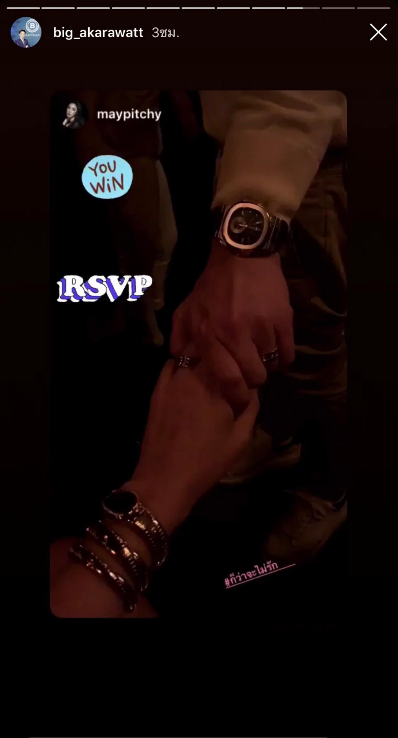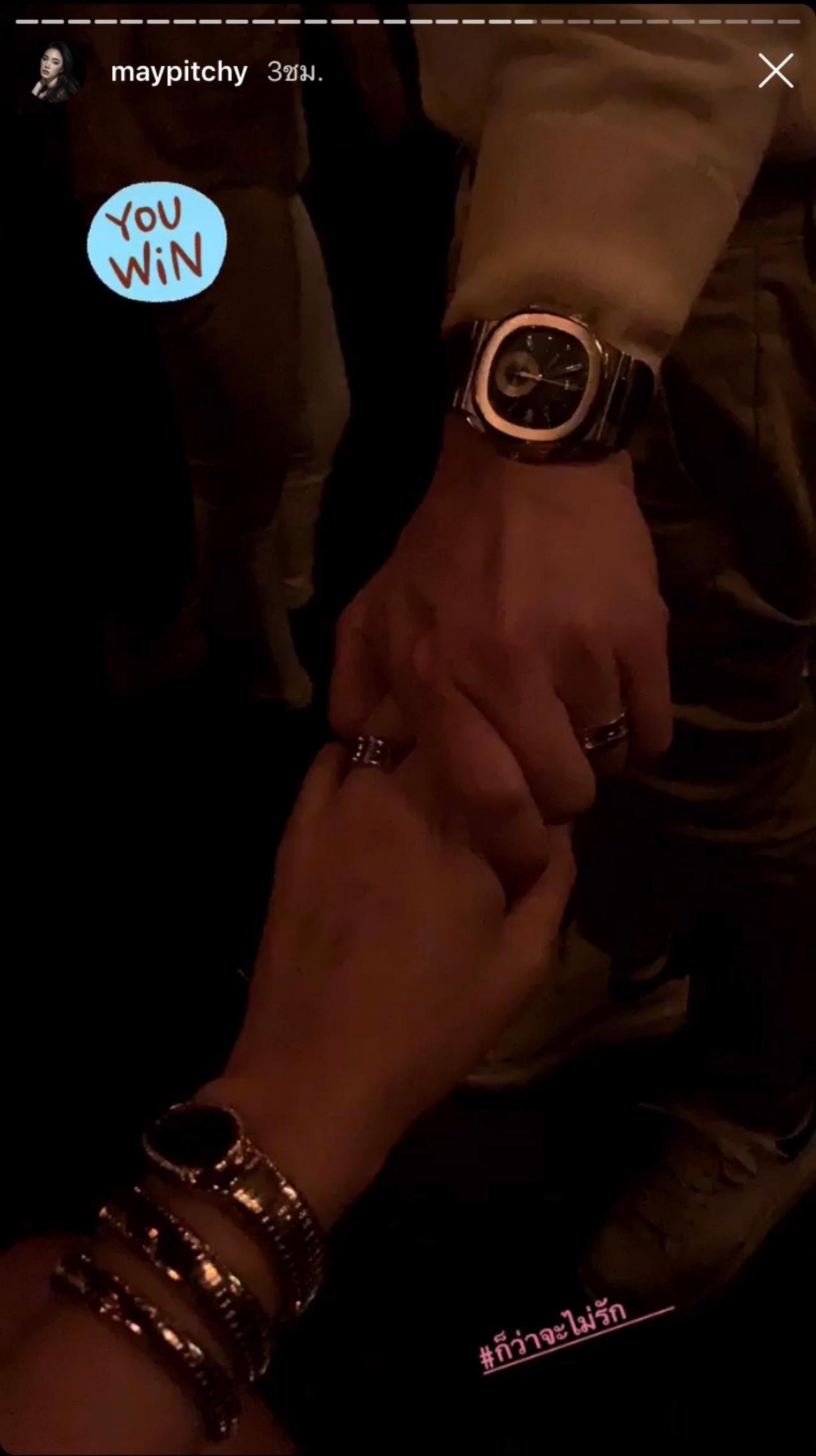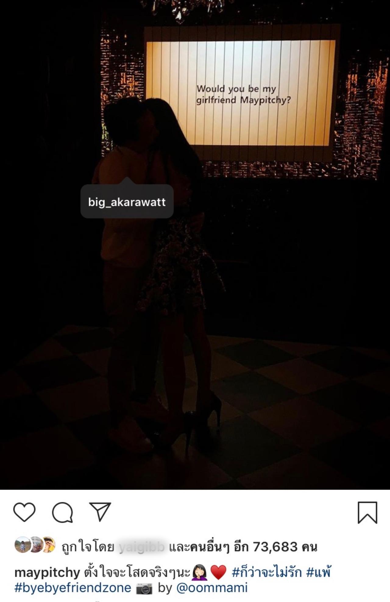หลังจากที่ไล่ย้อนดูไทม์ไลน์ของเมย์และบิ๊ก ก็จะเห็นว่าทั้งคู่น่าจะเริ่มคุยกันมาสักระยะแล้ว เพราะจะมีหนุ่มบิ๊กมาร่วมกิจกรรมต่างๆ อยู่บ่อยครั้งอีกด้วย และล่าสุด ในอินสตาแกรมของทั้งคู่ก็ได้เผยภาพที่หนุ่มบิ๊กทำเซอร์ไพรส์ของสาวเมย์เป็นแฟน โดยเมย์ได้เขียนแคปชั่นว่า “ตั้งใจจะโสดจริงๆนะ #ก็ว่าจะไม่รัก #แพ้” พร้อมแฮชแท็กว่า “byebyefriendzone”