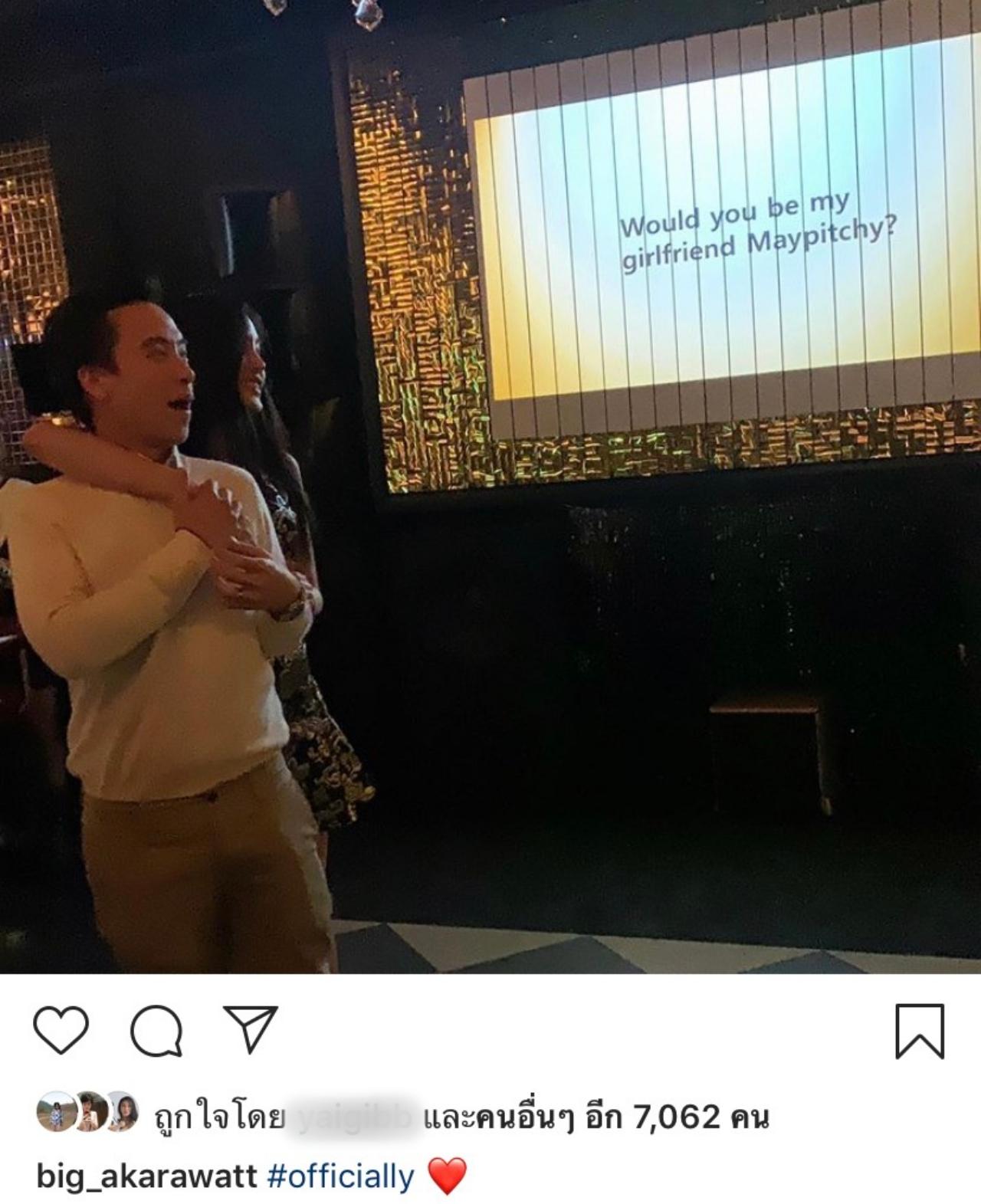 ทางด้านหนุ่มบิ๊ก อัครวัชร ก็ได้โพสต์ภาพพร้อมแคปชั่นว่า “Officiclly” เริ่มเป็นแฟนอย่างเป็นทางการแล้วอีกด้วย งานนี้ทำเอาเพื่อนพี่น้องในวงการเข้ามาคอมเมนต์แสดงความยินดีกับสาวเมย์กันอย่างมากมาย.