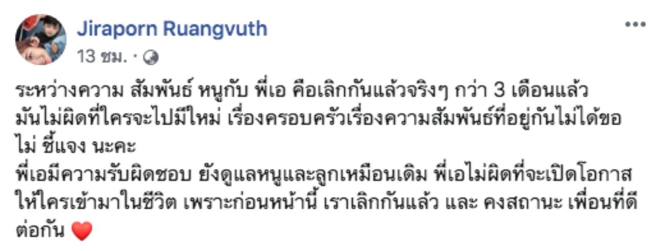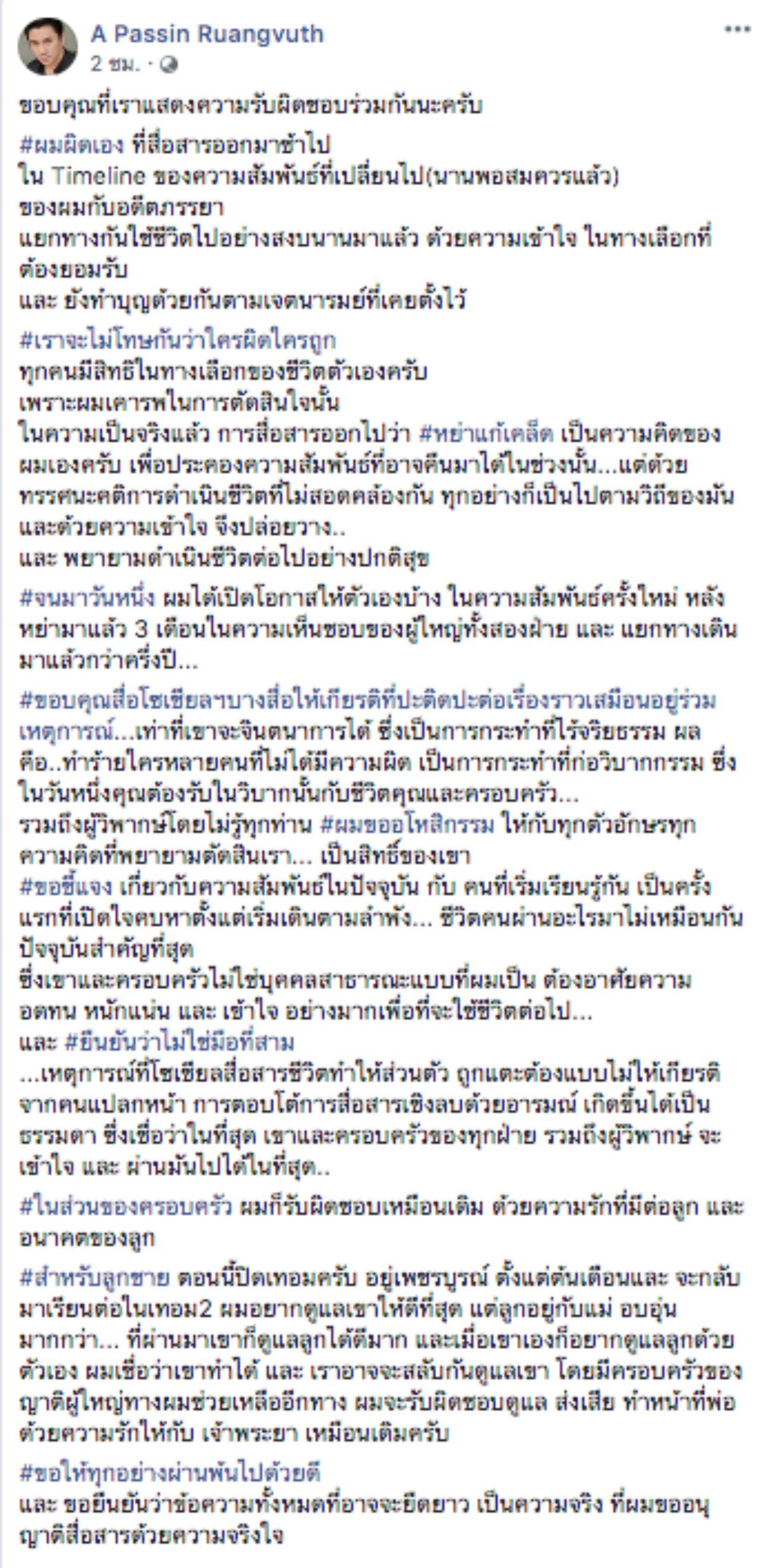 แม้รอบแรก เอ พศิน หย่า จะบอกว่าหย่าแก้เคล็ด แต่คราวนี้ข่าวเลิกของจริงไม่ติงนัง โดยเจ้าตัวโพสต์ประกาศยาวยืด “ขอบคุณที่เราแสดงความรับผิดชอบร่วมกันนะครับ