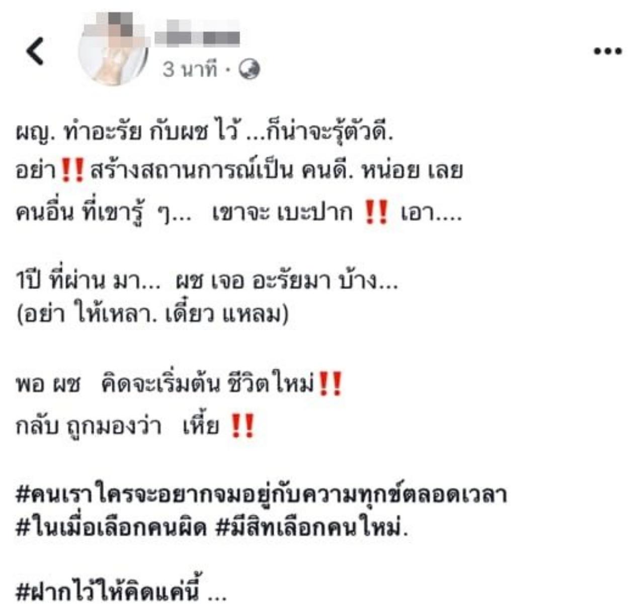 "ผู้หญิงทำอะไรกับผู้ชายไว้ น่าจะรู้ตัวดี อย่าสร้างสถานการณ์คนดีหน่อยเลย คนอื่นที่เขารู้ๆ เขาจะเบะปากเอา 1 ปี ผู้ชายเจออะไรมาบ้าง (อย่าให้เหลาเดี๋ยวแหลม) พอผู้ชายคิดจะเริ่มต้นชีวิตใหม่ กลับถูกมองว่า เ_ี้ย #คนเราใครอยากจะจมอยู่กับความทุกข์ตลอดเวลา #ในเมื่อเลือกคนผิด #มีสิทธิ์เลือกคนใหม่ #ฝากไว้ให้คิดแค่นี้”