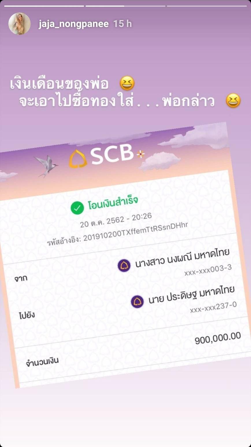 ล่าสุด จ๊ะ โพสต์ภาพสลิปโอนเงินให้คุณพ่อประดิษฐ์ มหาดไทย ในไอจีสตอรี่ โดยเขียนแคปชั่นในรูปว่า “เงินเดือนของพ่อ จะเอาไปซื้อทองใส่...พ่อกล่าว” ซึ่งพอเห็นยอดเงินในสลิปที่ จ๊ะ โอนให้คุณพ่อทำเอาหลายคนตาลุกวาว เพราะยอดเงินสูงถึง 900,000 บาท เลยทีเดียว
