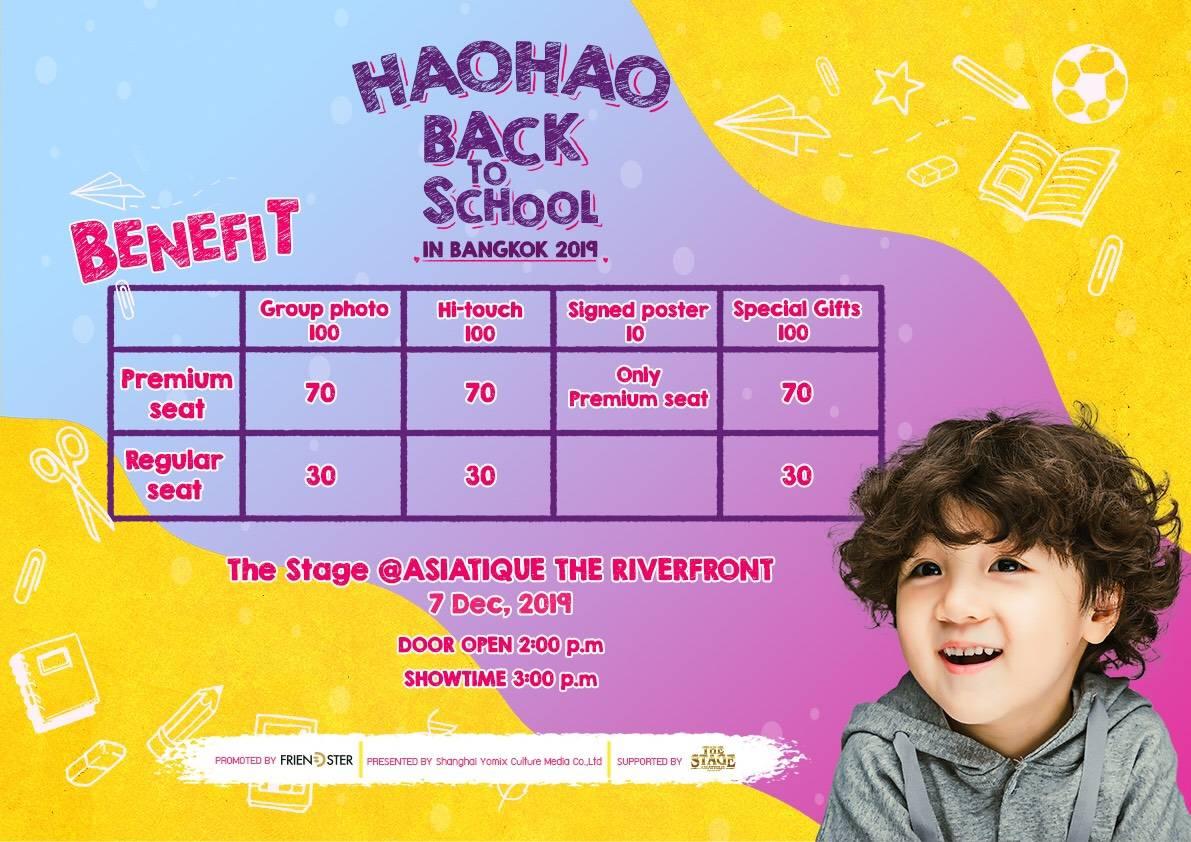 โดยปีนี้ บริษัท เฟรนด์สเตอร์ จำกัด (Friendster) เอาใจแฟนๆ พาลูกพี่ห่าว มาแจกความสดใส และความน่ารักกันอีกครั้ง ใน “HaoHao Back to School in Bangkok 2019” ที่จะมีขึ้นในวันเสาร์ที่ 7 ธันวาคมนี้ ณ Asiatique The Riverfront (เอเชียทีค เดอะ ริเวอร์ฟร้อนท์) ซึ่งจะเปิดจำหน่ายบัตรวันแรก วันเสาร์ ที่ 2 พฤศจิกายน 2562 เวลา 10.00 น. (ประเทศไทย) ทาง www.friendsterth.com ราคาบัตร Premium 3,500 บาท / Regular 2,500 บาท / Restricted view 2,000 บาท