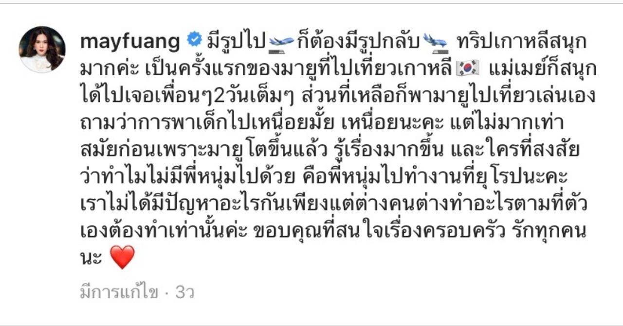 งานนี้เพื่อไม่ให้หลายคนคิดมากไป สาวเมย์เลยได้โพสต์ชี้แจงถึงปมเรื่องดังกล่าวที่หลายคนคาใจอยากรู้สาเหตุว่าทำไมทั้งหนุ่มและเมย์ถึงได้แยกกันไปเที่ยวอย่างนี้ โดยสาวเมย์ได้โพสต์ข้อความลงในอินสตาแกรมพูดถึงความรู้สึกหลังพาลูกสาวไปเที่ยวต่างประเทศด้วยกันว่าทั้งสนุกและเหนื่อยมากๆ
