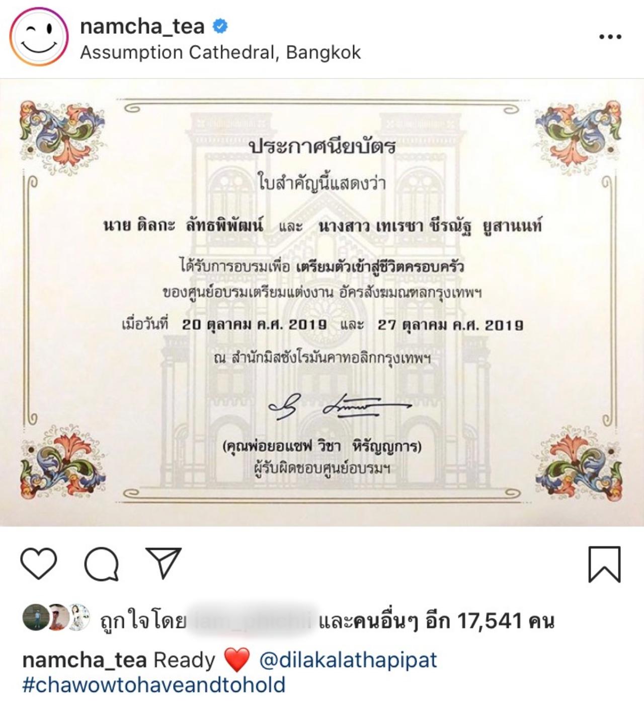 และล่าสุด น้ำชา ก็ได้โพสต์รูปประกาศนียบัตร หลังจากที่จูงมือ ดร.วาว ไปอบรม เตรียมตัวเข้าสู่ชีวิตครอบครัว ของศูนย์อบรมเตรียมแต่งงาน อัครสังฆมณฑลกรุงเทพฯ ซึ่งหลังจากที่สาวน้ำชาโชว์ใบประกาศนียบัตรดังกล่าวไป ก็มีเพื่อนๆ และแฟนๆ เข้ามาคอมเมนต์แสดงความยินดีกับสาวน้ำชาอย่างล้นหลาม